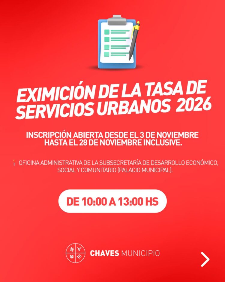 Leer másChaves Municipio informa: se abre la inscripción para la eximición de la tasa de servicios urbanos 2026