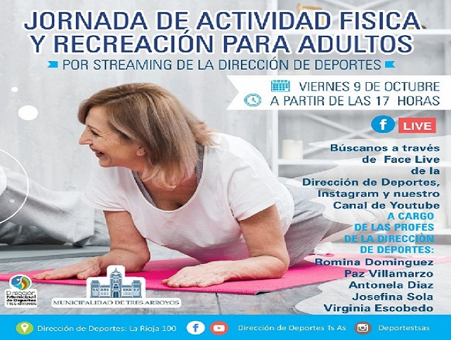 La Dirección de Deportes se encuentra organizando una Jornada Especial de Actividad Fisica y Recreativa para Adultos a través de Streaming para el día Viernes 09 de octubre a partir de las 17 horas.-