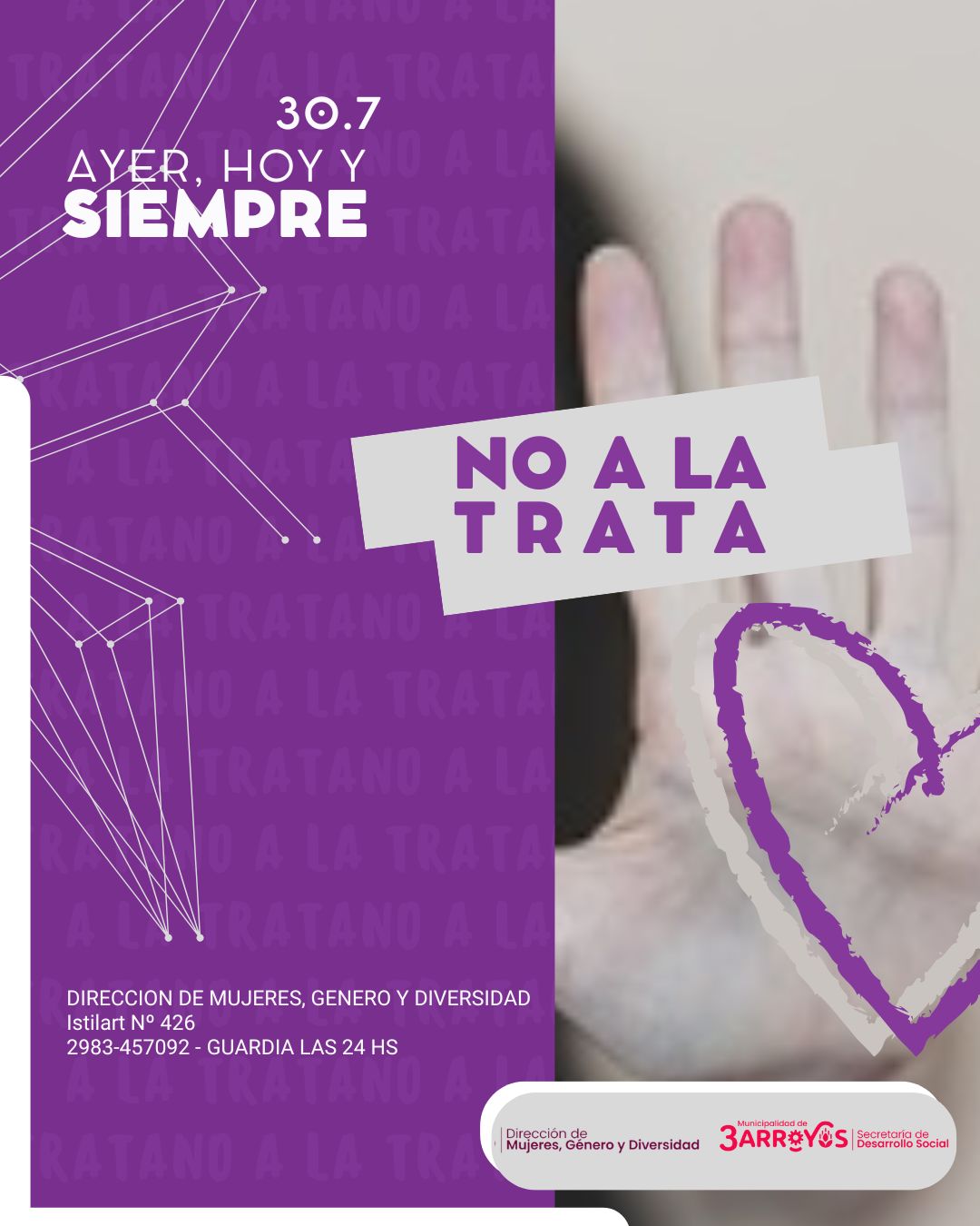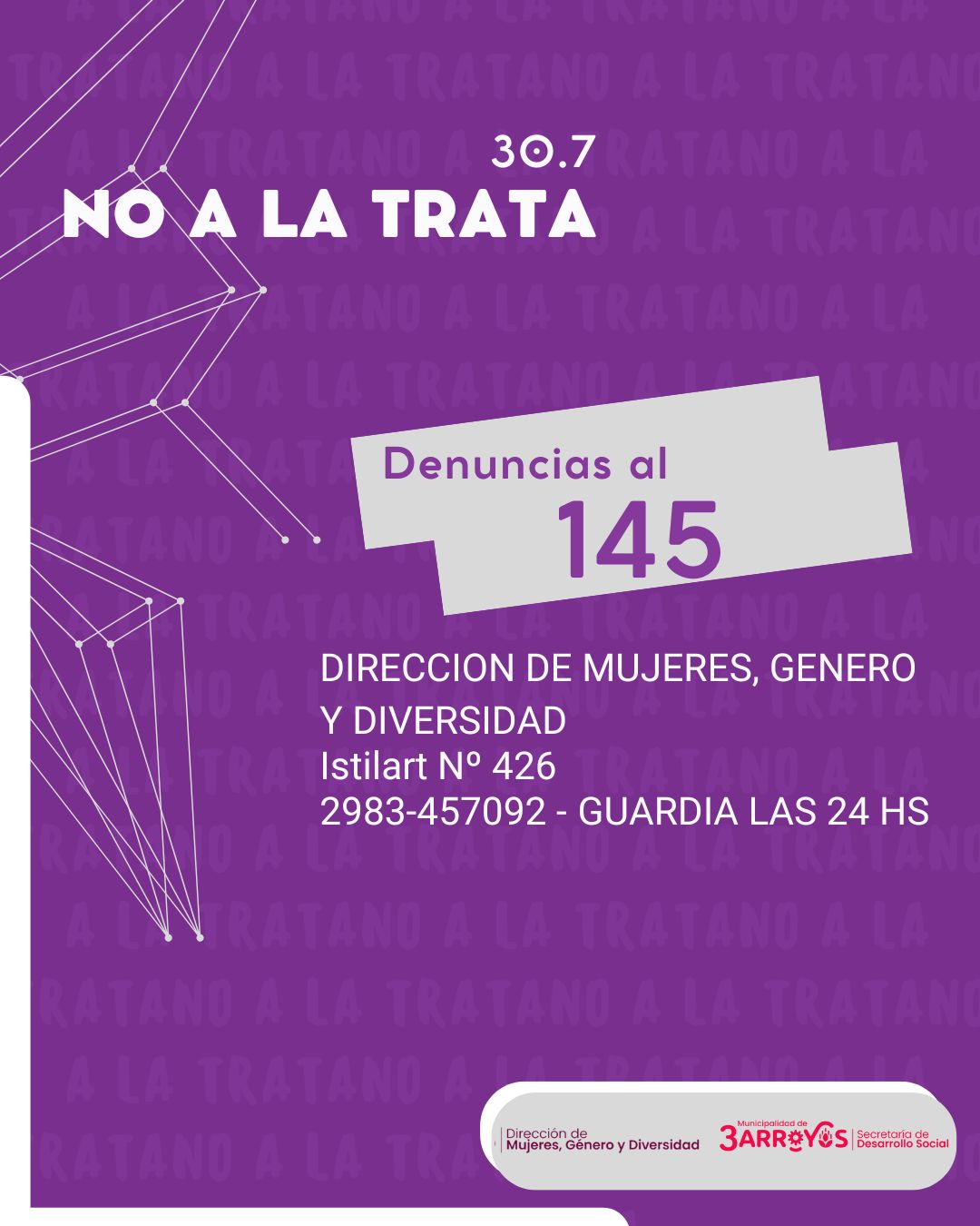 En este contexto, la Dirección de Mujeres, Genero y Diversidad dependiente de la Secretaria de Desarrollo Social, recuerda a la comunidad la importancia de estar informada, alerta y comprometida para visibilizar, prevenir y erradicar este delito que vulnera derechos fundamentales. Por lo cual, en caso de ser testigo o víctima de una situación de trata o explotación sexual y laboral, podés realizar la denuncia a la línea nacional 145, gratuita, confidencial, anónima y disponible las 24 horas, los 365 días del año.