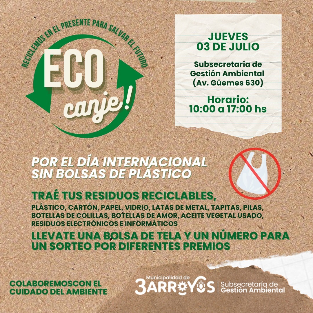 La Subsecretaría de Gestión Ambiental informa que hoy a partir de las 10hs se realizará el eco canje, se podrán entregar elementos reciclables como cartones, papeles, vidrio, plásticos, residuos electrónicos e informáticos, tetrabrik, pilas usadas, botellas de amor, colillas y aceite vegetal usado, los interesados podrán acercar sus residuos en la sede de la subsecretaría AV. Güemes N° 630, en hasta las 17 hs.