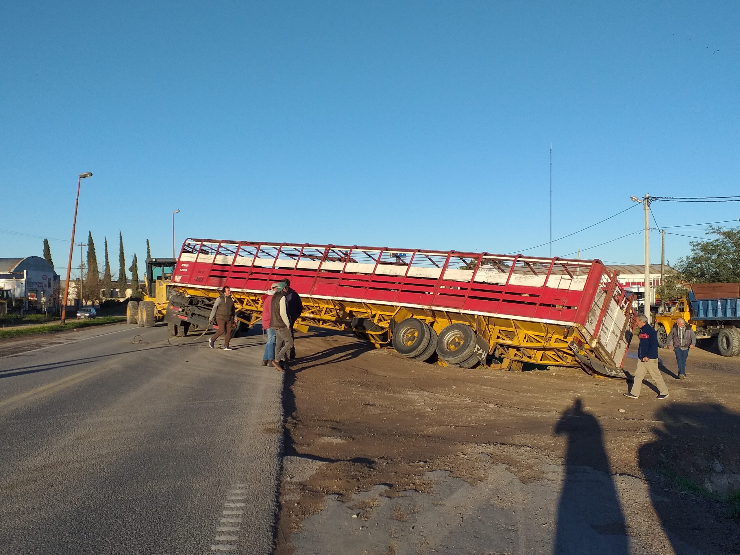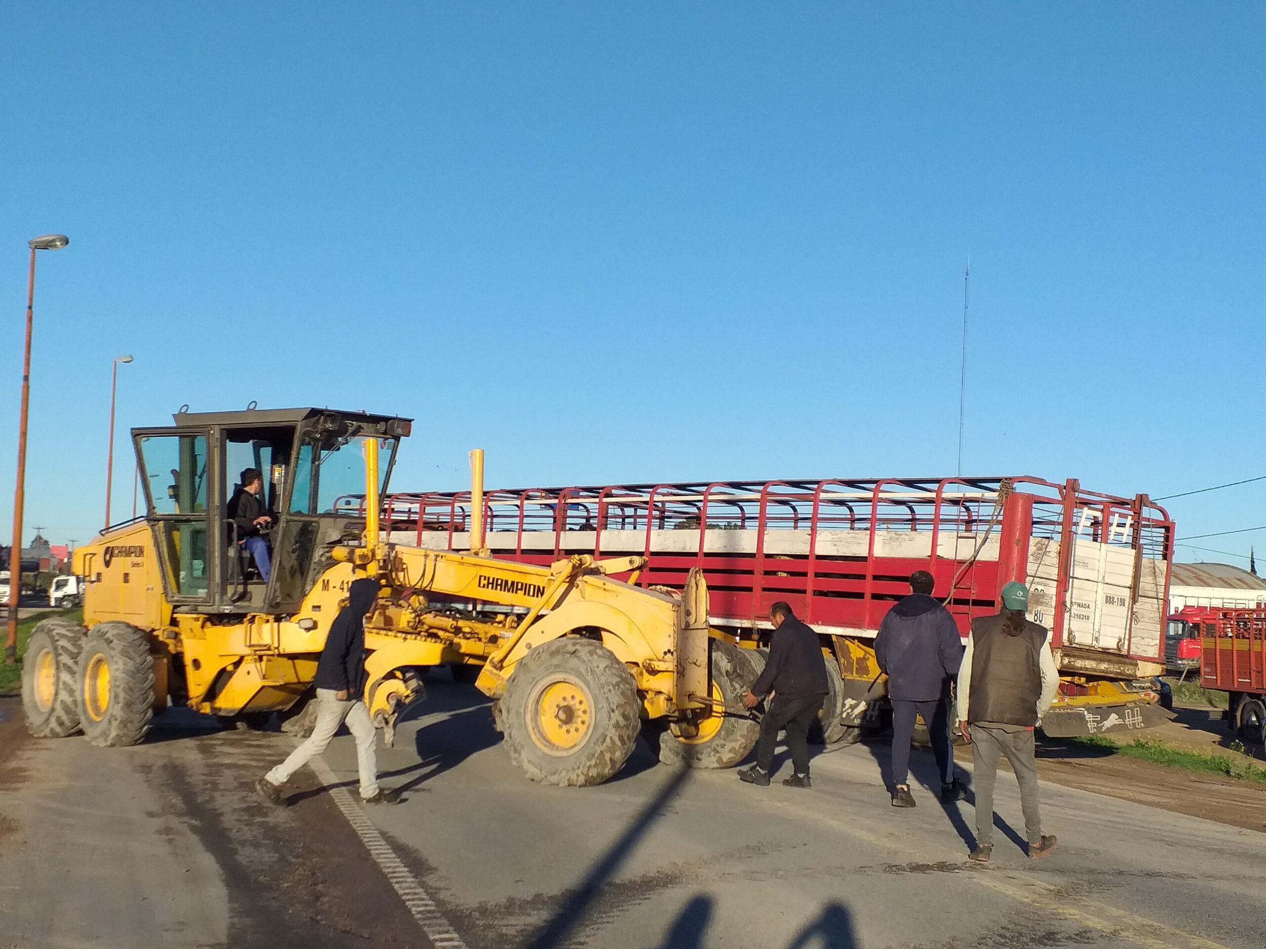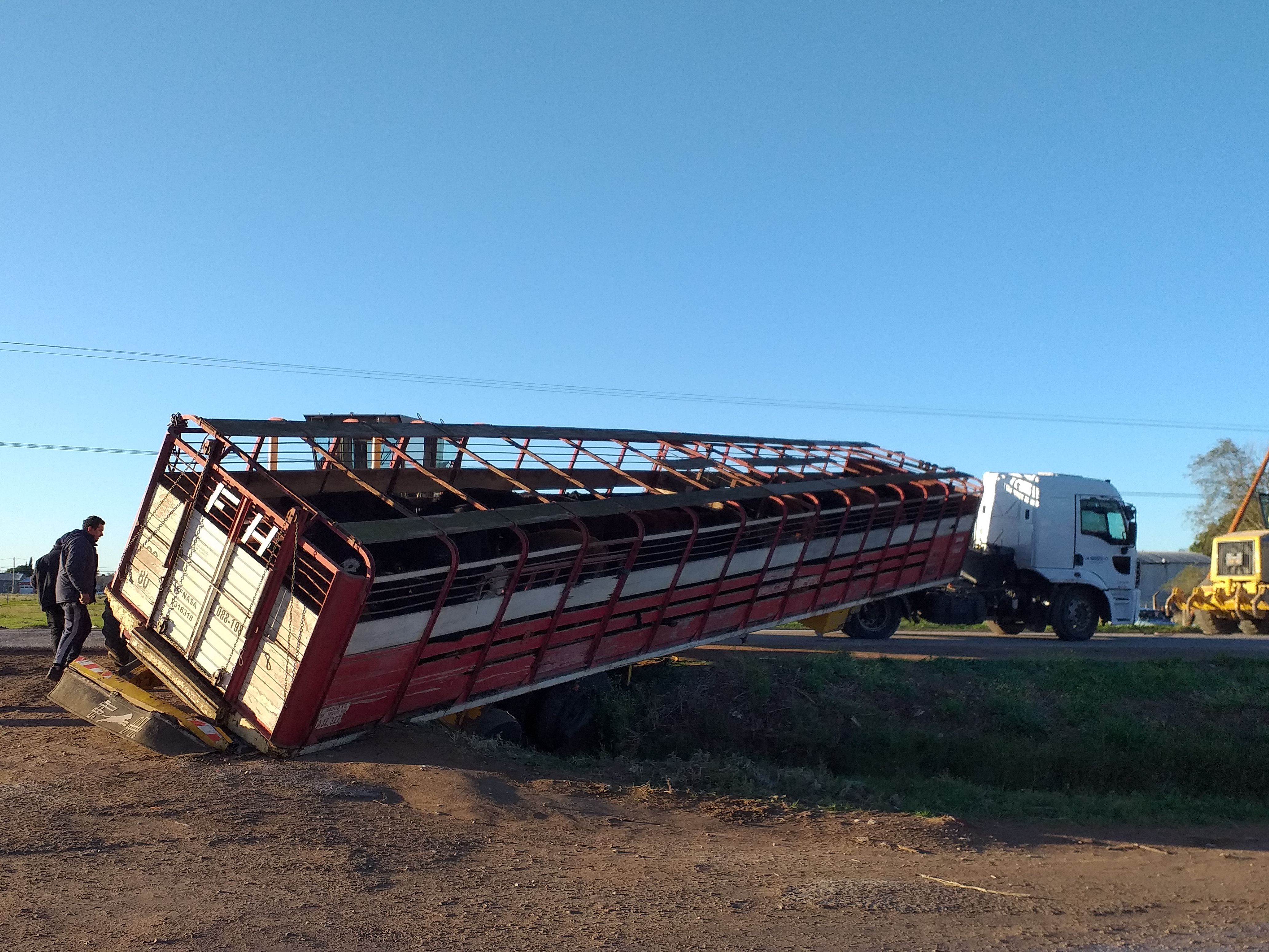 Un camión jaula debió ser liberado por una motoniveladora tras quedar colgado en una zanja sobre ruta 3 y Laprida, sitio que acarrea numerosos episodios similares.