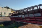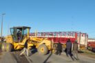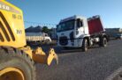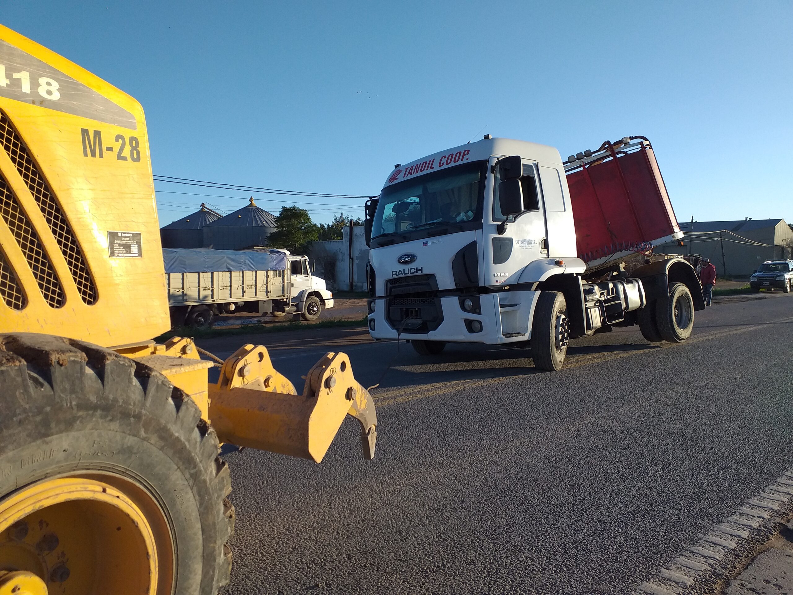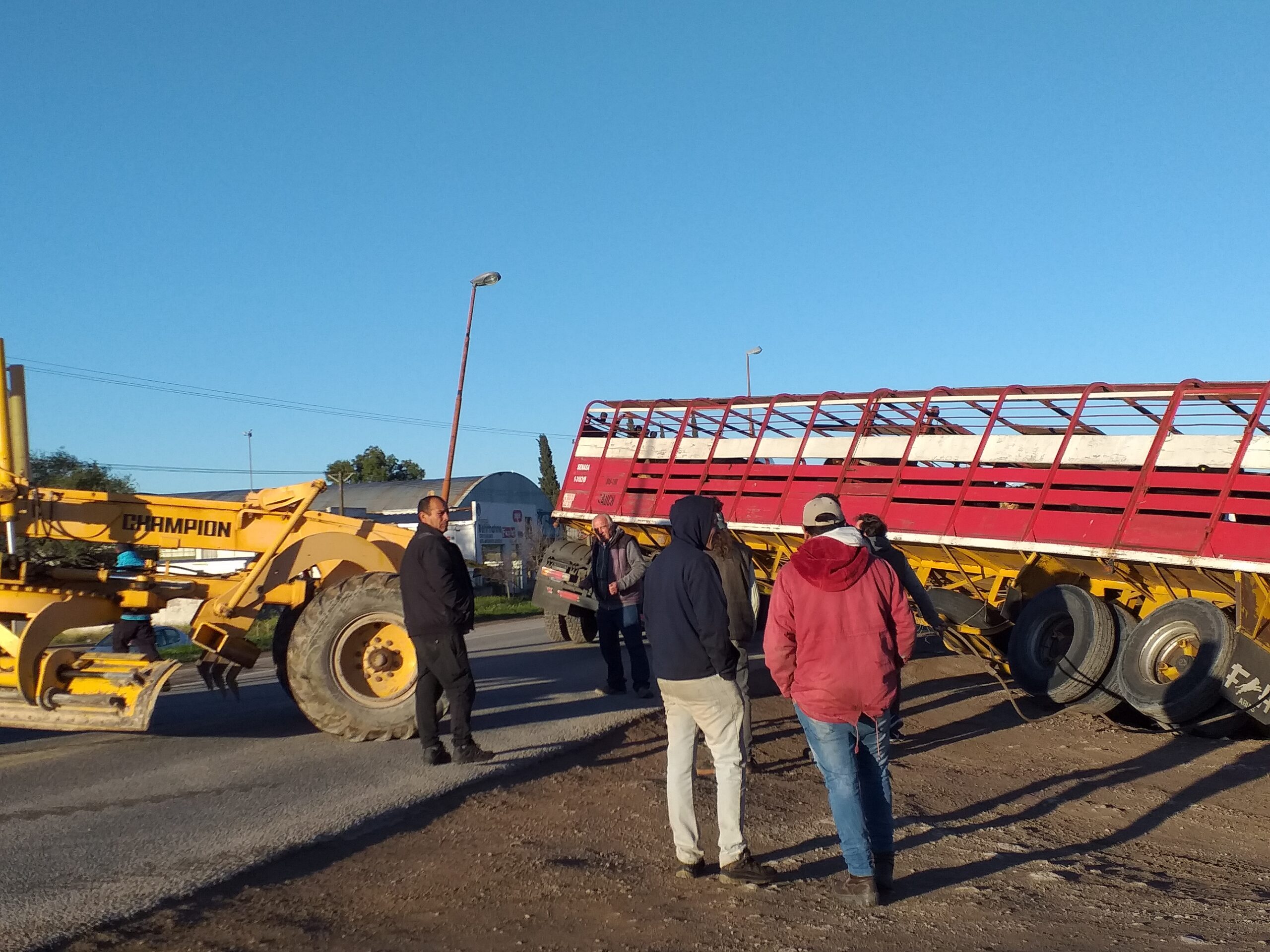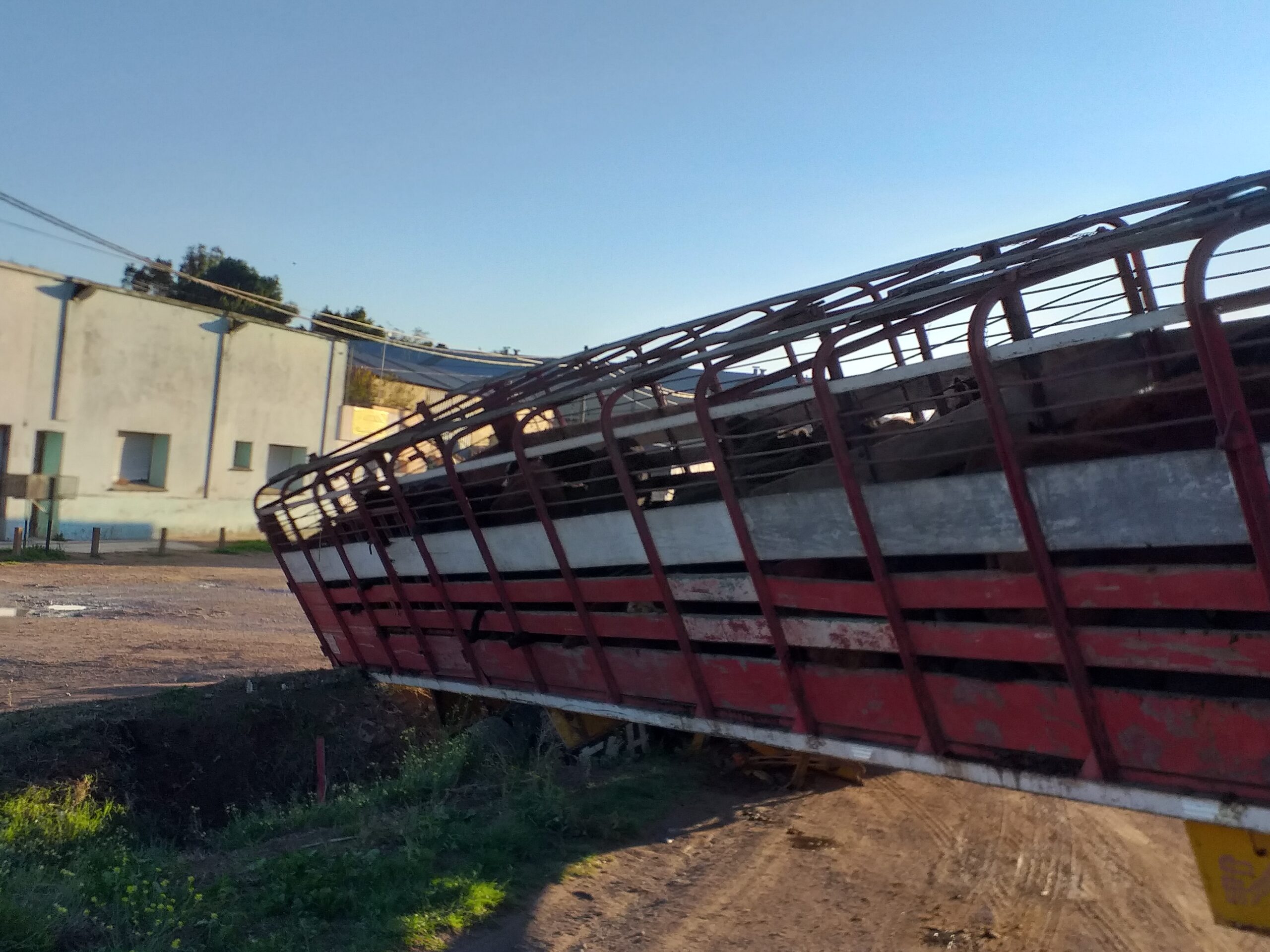 Un camión jaula debió ser liberado por una motoniveladora tras quedar colgado en una zanja sobre ruta 3 y Laprida, sitio que acarrea numerosos episodios similares.