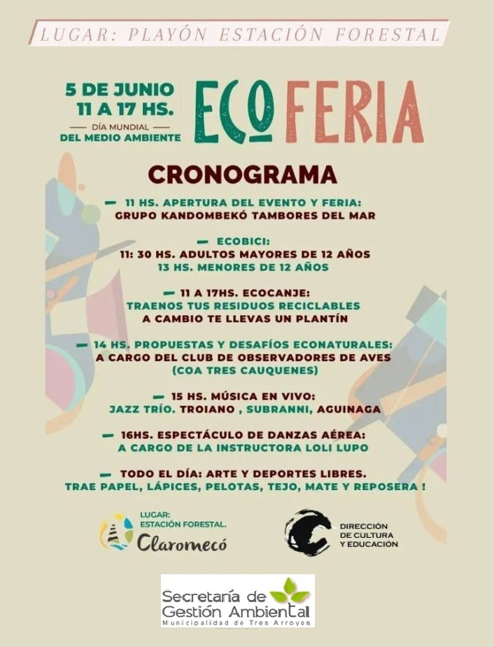 Con motivo de conmemorarse el Día Mundial del Medio Ambiente, la Secretaría de Gestión Ambiental y el Organismo Descentralizado Claromecó Servicios Turísticos una Eco Feria el domingo 5 de junio en el playón del Vivero de 11 a 17 horas.
