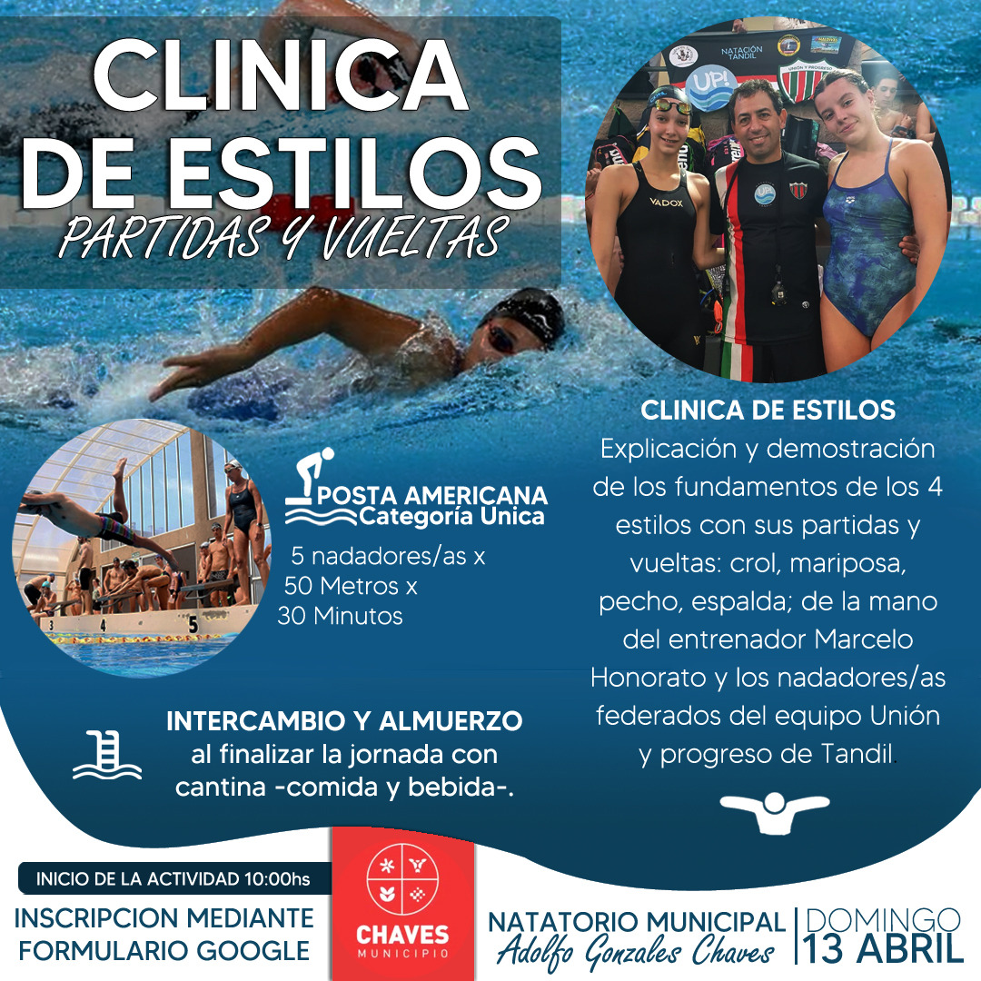 Este domingo 13 de abril, el Natatorio Municipal de Gonzales Chaves será sede de una Clínica de Estilos abierta a toda la comunidad, con la participación destacada del entrenador Marcelo Honorato, integrante del equipo Unión y Progreso de Tandil.