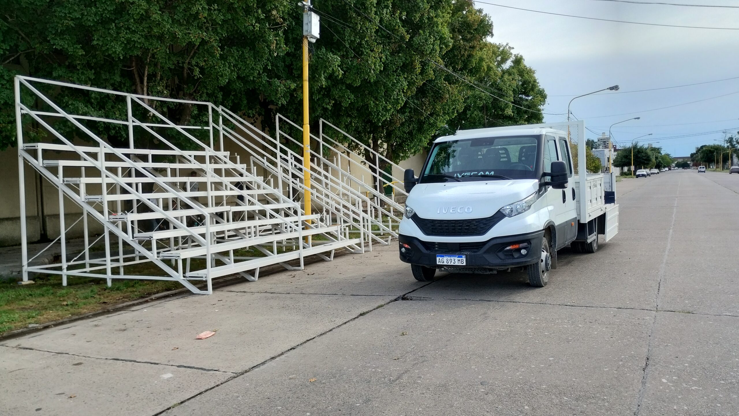 Asimismo, personal municipal comenzó a instalar las gradas ubicadas en el predio sobre Ituzaingó.