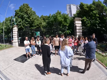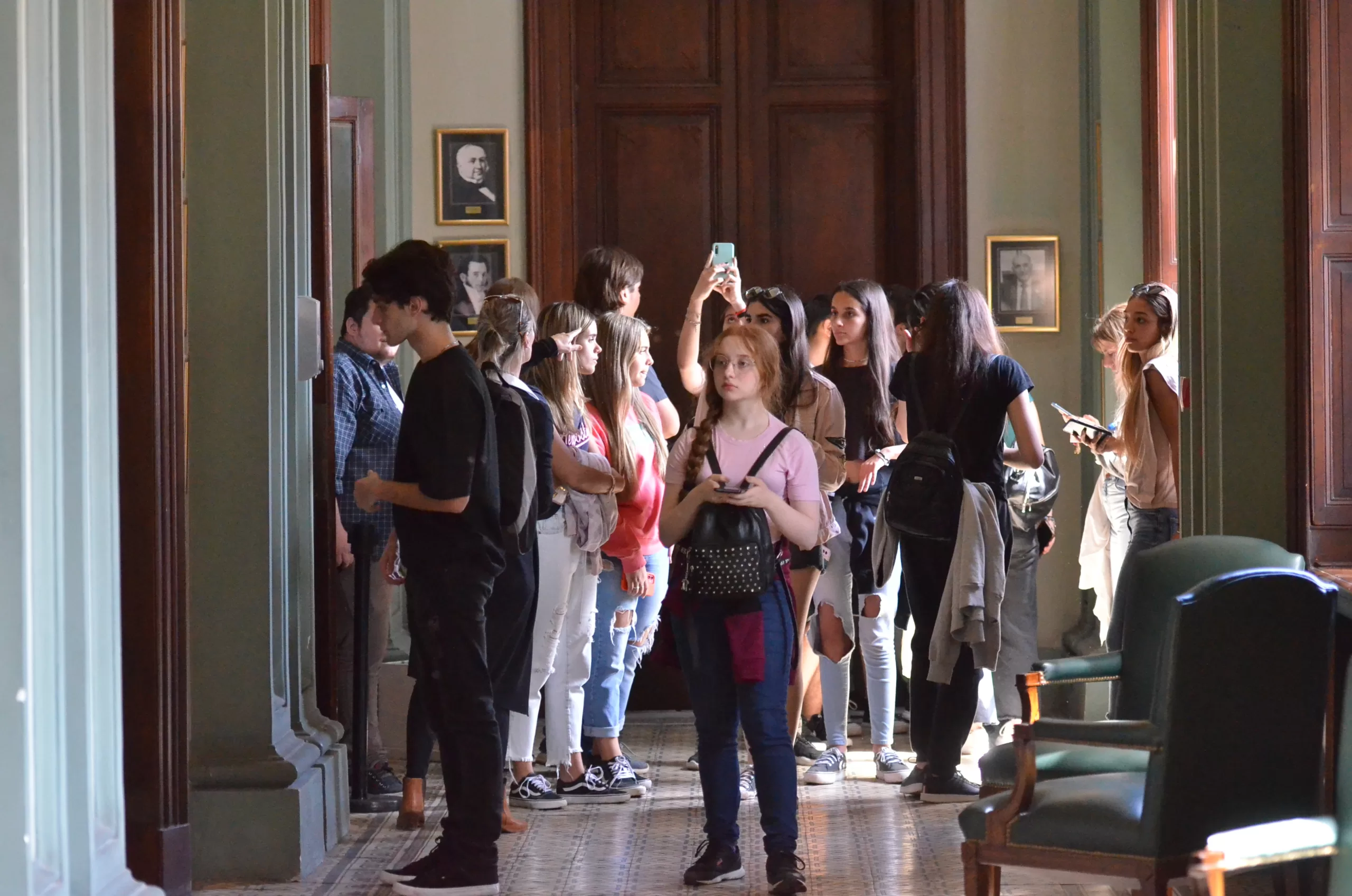 Allí se organizó una recorrida por lugares de valor histórico y uno de los edificios incluidos en esta actividad es la Legislatura, acompañados por la profesora Giselle Petersen Díaz y el vicedirector de Nivel Secundario, Gastón Asserquet.