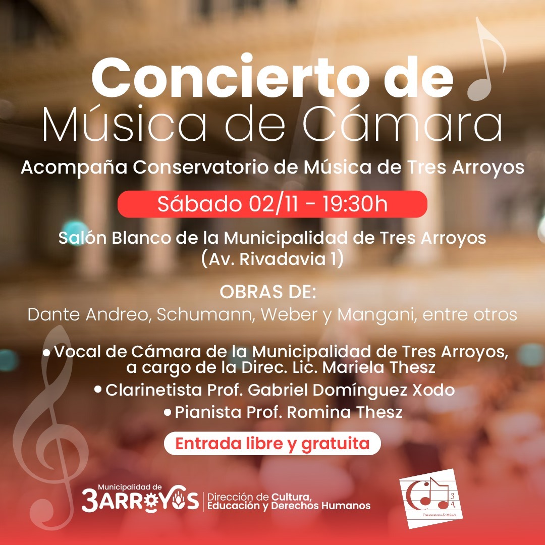 La Dirección de Cultura, Educación y DD. HH de la Municipalidad de Tres Arroyos, invita al público al Concierto de Música de Cámara, que se llevará a cabo el sábado 02 de noviembre a las 19.30 horas, en el Salón Blanco del Palacio Municipal (Av. Rivadavia Nº1).