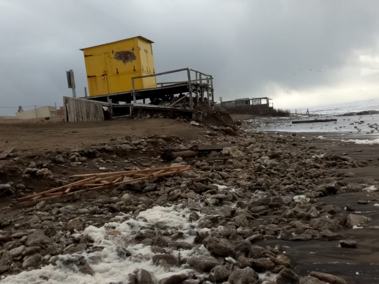 Durante todo el día de ayer y la mañana de hoy, las fuertes ráfagas de viento y la crecida en la Costanera fueron el paisaje característico junto al corrimiento de la arena que dejó expuesta la base rocosa.