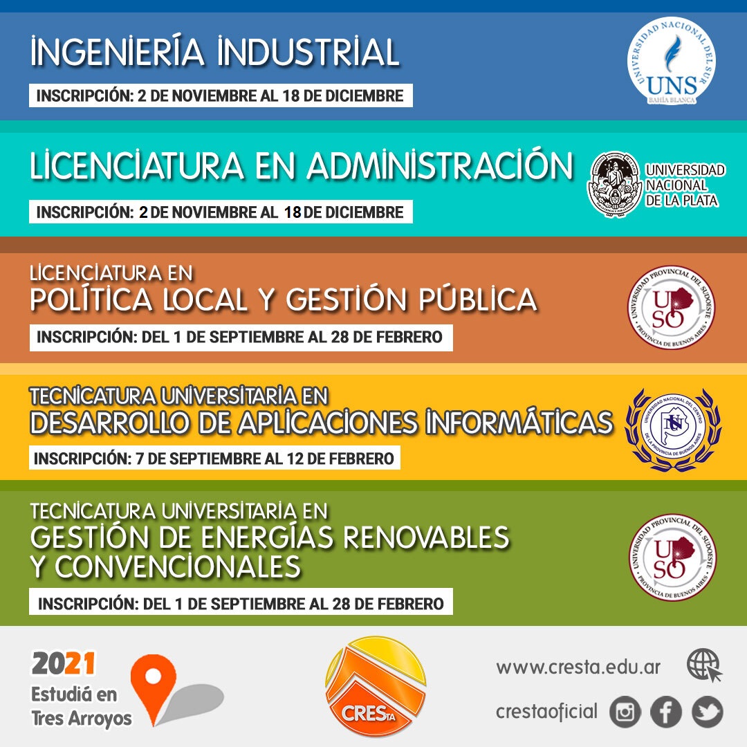 En todos los casos, los interesados deberán inscribirse a través de la web de CRESTA, en la solapa ACADÉMICA/ INGRESO 2021.