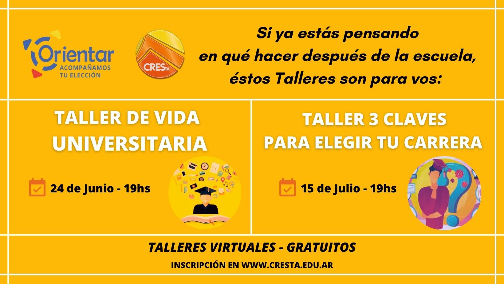 Tanto los talleres, como el proceso de Orientación Vocacional son gratuitos y la inscripción se realiza por medio de www.cresta.edu.ar.