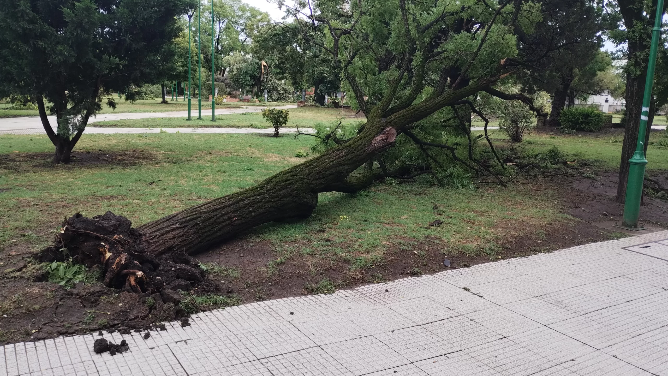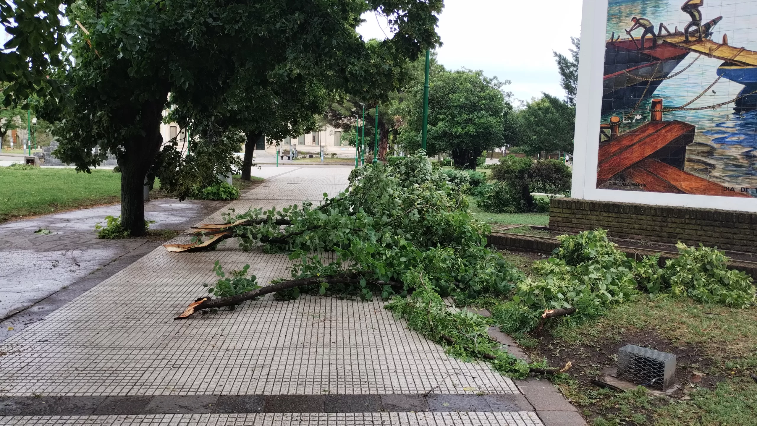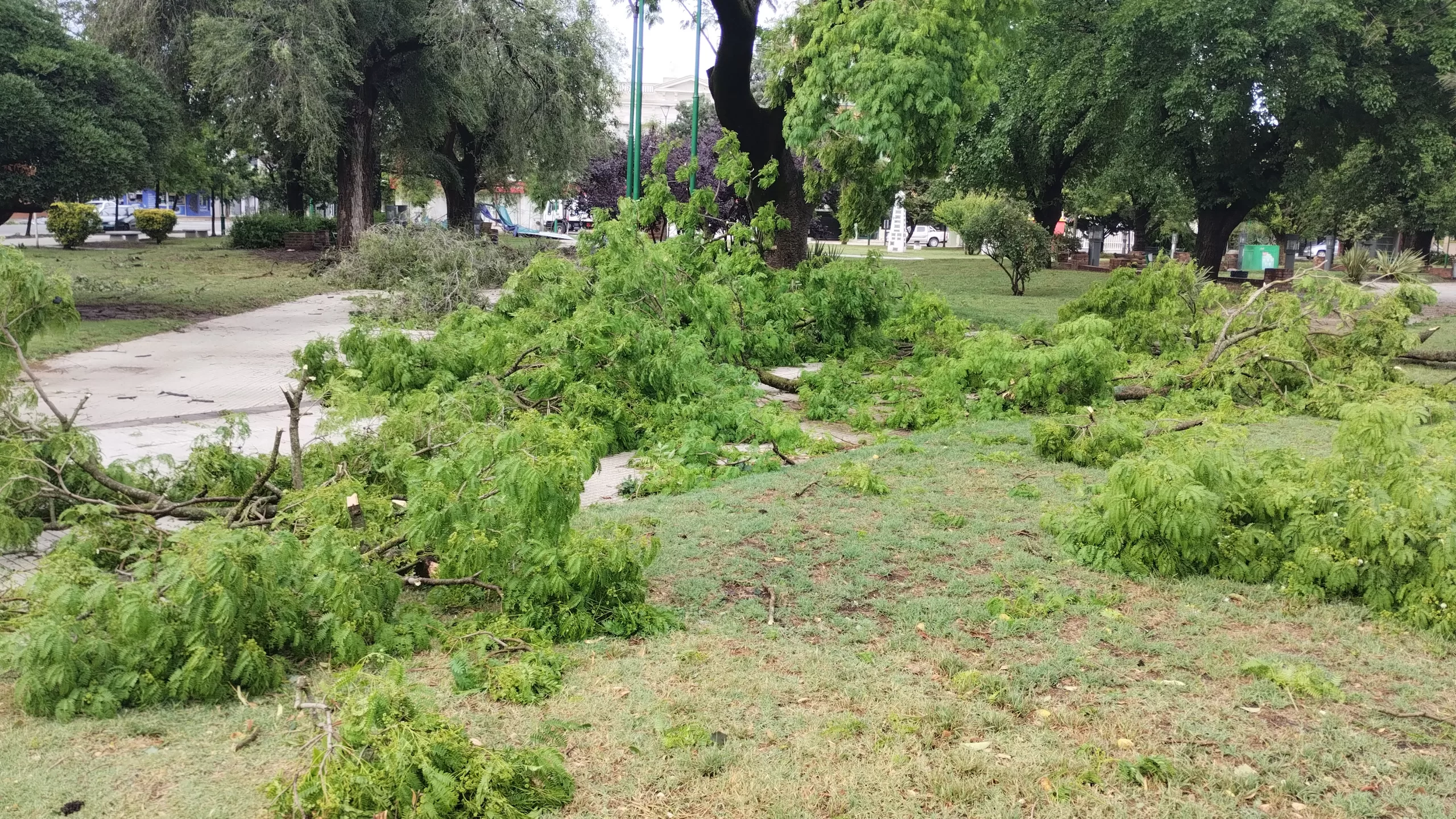 En la céntrica Plaza San Martín voló el puesto de artesanos ubicado en Betolaza y Colón mientras que los enormes gajos cayeron sobre columnas de alumbrado y juegos en ésta, la Italia, la Francia y la del Árbol.