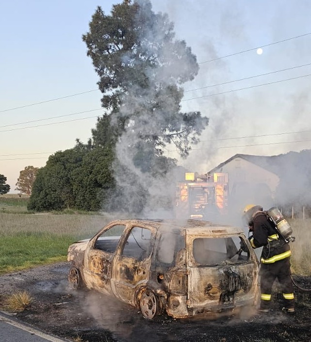 Al arribar al lugar, la dotación observó un auto prendido fuego en su totalidad en la banquina de la ruta en dirección a San Francisco de Bellocq.