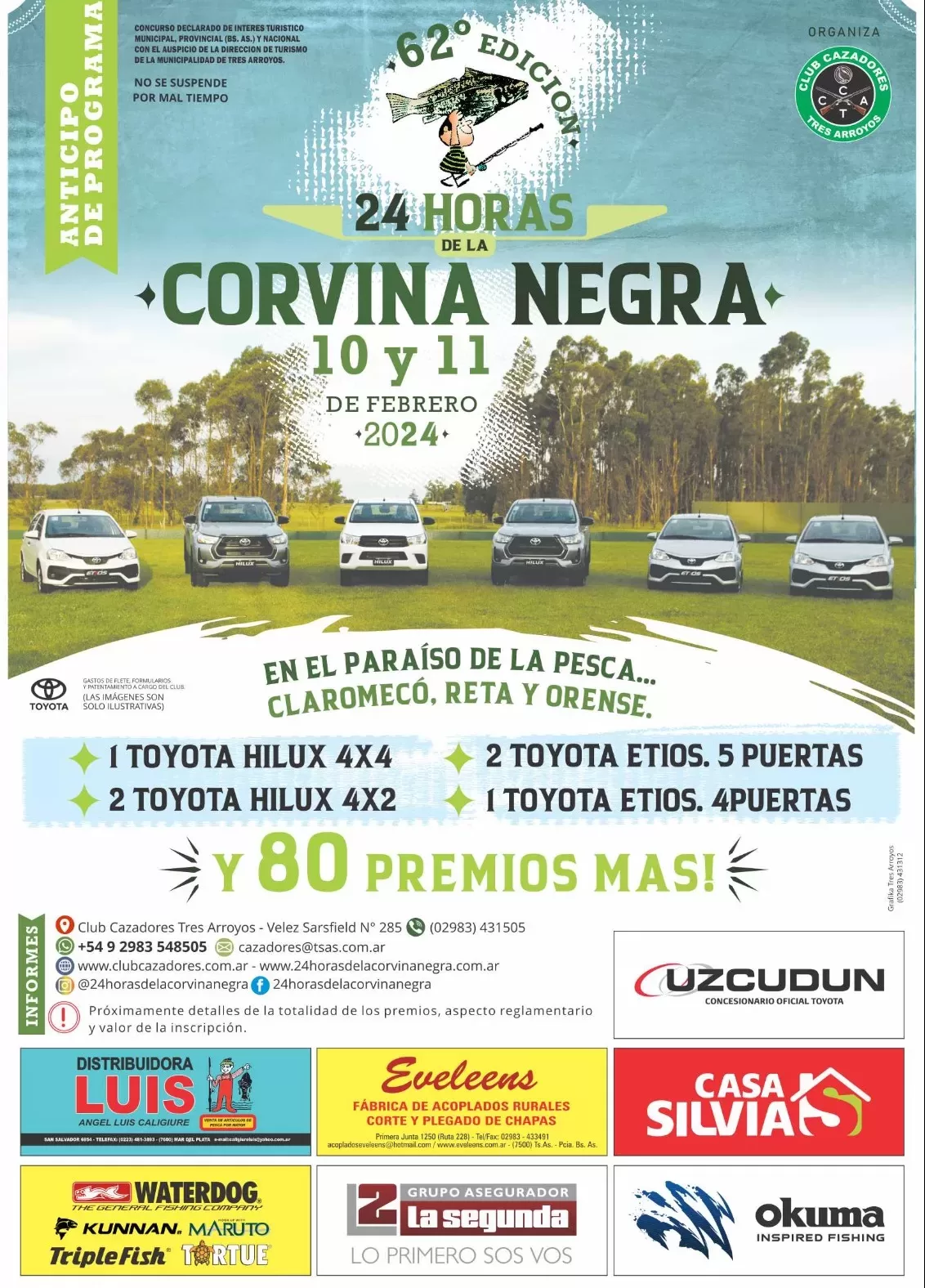 La comisión de pesca de la entidad ratificó que los premios contabilizan ochenta en total y se entregarán tres camionetas Toyota Hilux (una 4×4 y dos 4×2) y tres Toyota Etios (dos cinco puertas y uno cuatro puertas) en el certamen pesquero por excelencia de Claromecó, Reta y Orense.