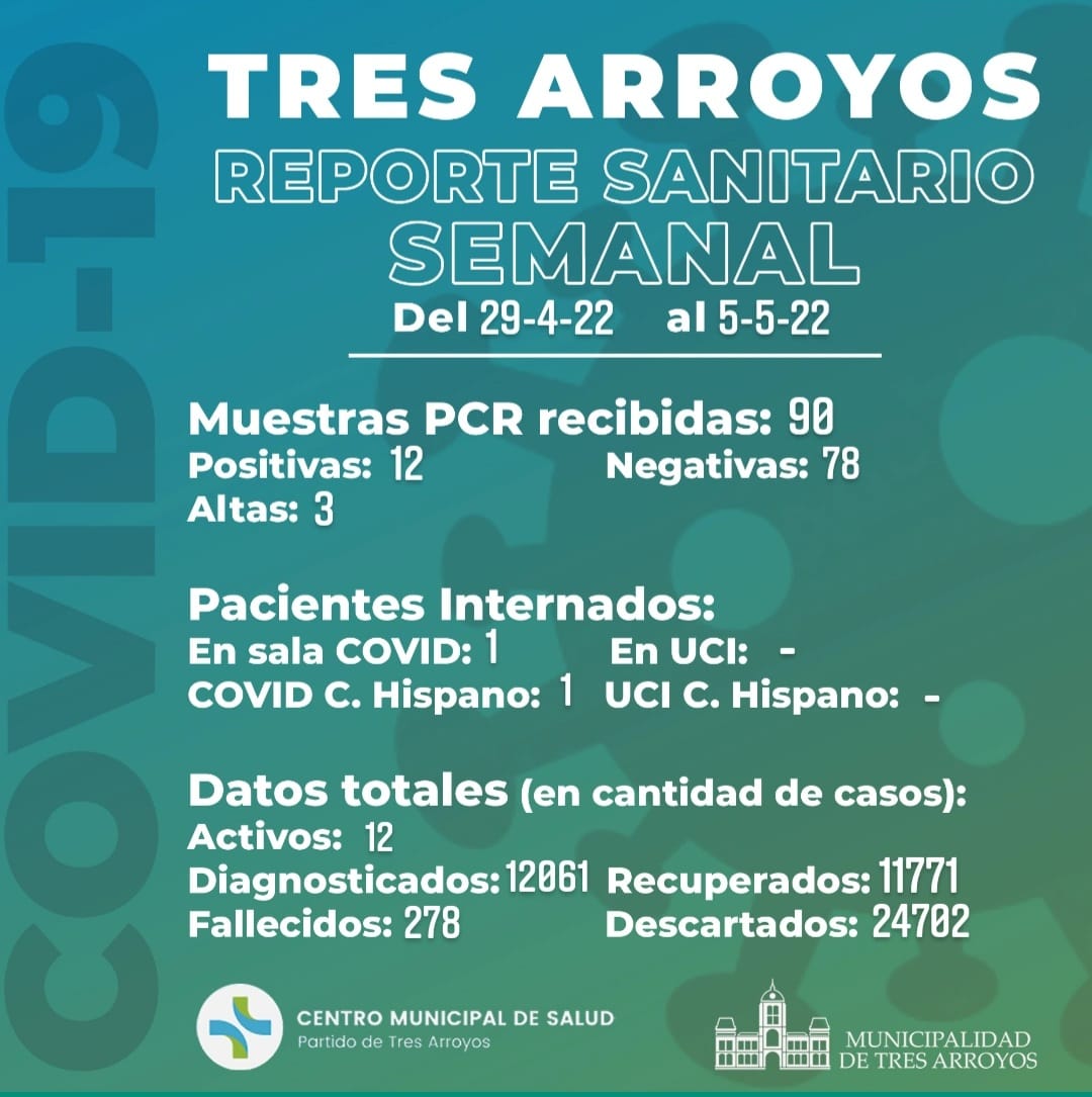 Además, los casos activos son doce mientras que la semana pasada contabilizaron cuatro. Por otra parte, hay un paciente internado en la sala Covid y otro en la del Hispano por la afección.