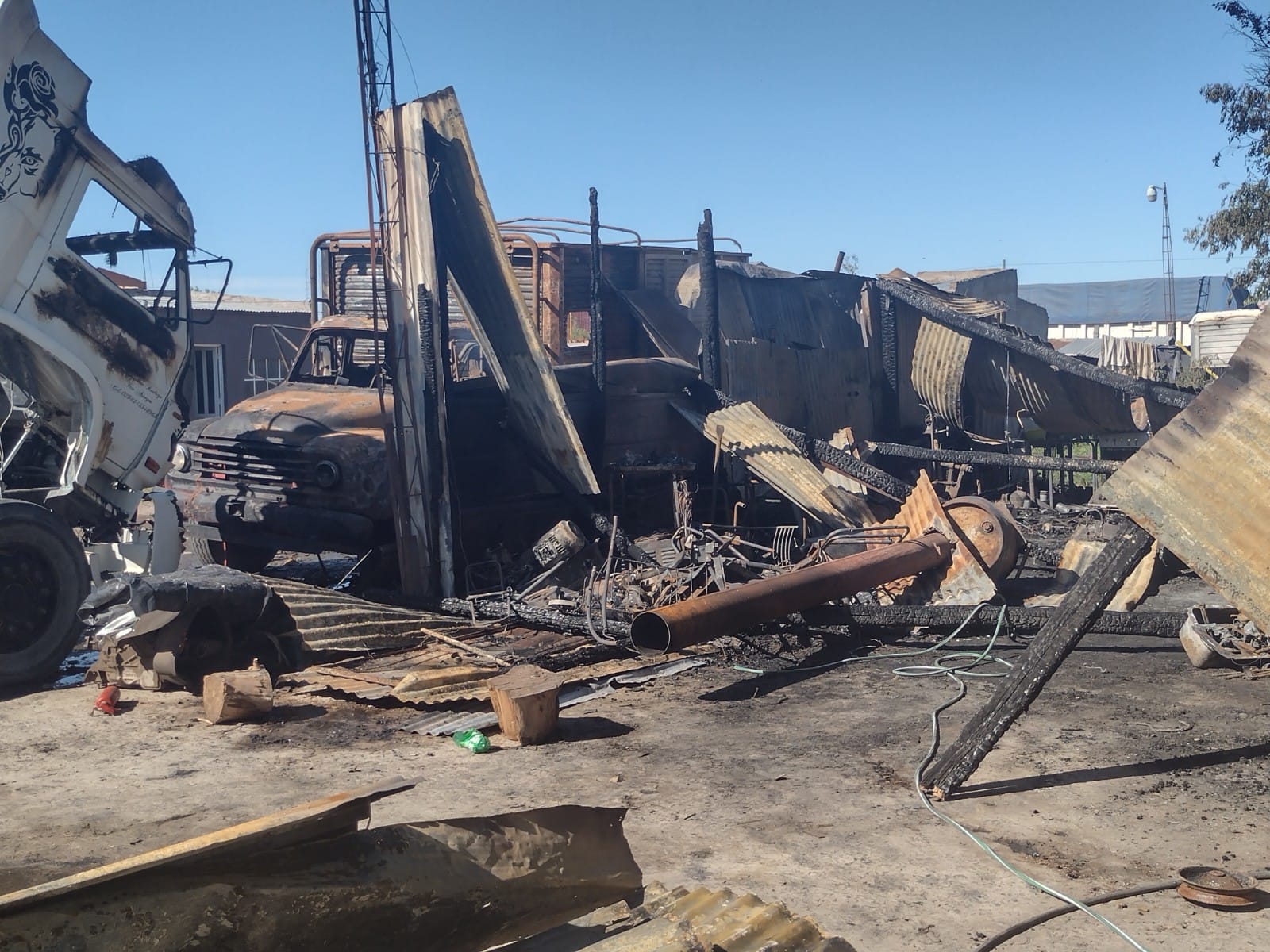 Un galpón devastado y dos camiones con daños casi totales fue el saldo de un incendio aparentemente intencional perpetrado esta madrugada en Sargento Cabral 1445.
