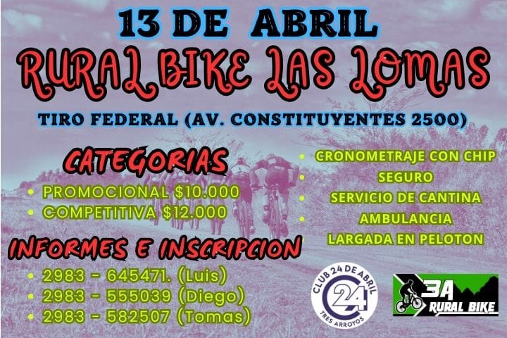 A buen ritmo se están efectuando las inscripciones para la primera edición de la competencia de rural bike denominada “Las Lomas” organizada por el Club Tres Arroyos 24 de Abril y que se realizará el domingo 13 de abril..