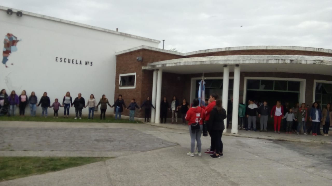 Una nutrida delegación de vecinos, alumnos y miembros de la comunidad participaron de un emotivo abrazo solidario a la Escuela 5 luego del voraz incendio que consumió sus instalaciones.