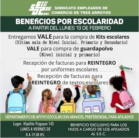 El Sindicato Empleados de Comercio informa a sus afiliados con hijos a cargo en edad escolar, que a partir del lunes 13 y durante febrero y marzo, se estarán entregando los vales para la adquisición del kit escolar desde la última salita de jardín, primaria y secundaria.
