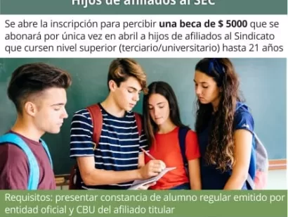 Asimismo, el beneficio incluye a los hijos estudiantes de nivel superior (terciario / universitario) hasta 21 años, que a partir del lunes 13 se abre la inscripción para percibir una beca de $5 mil a abonarse por única vez en el mes de abril.
