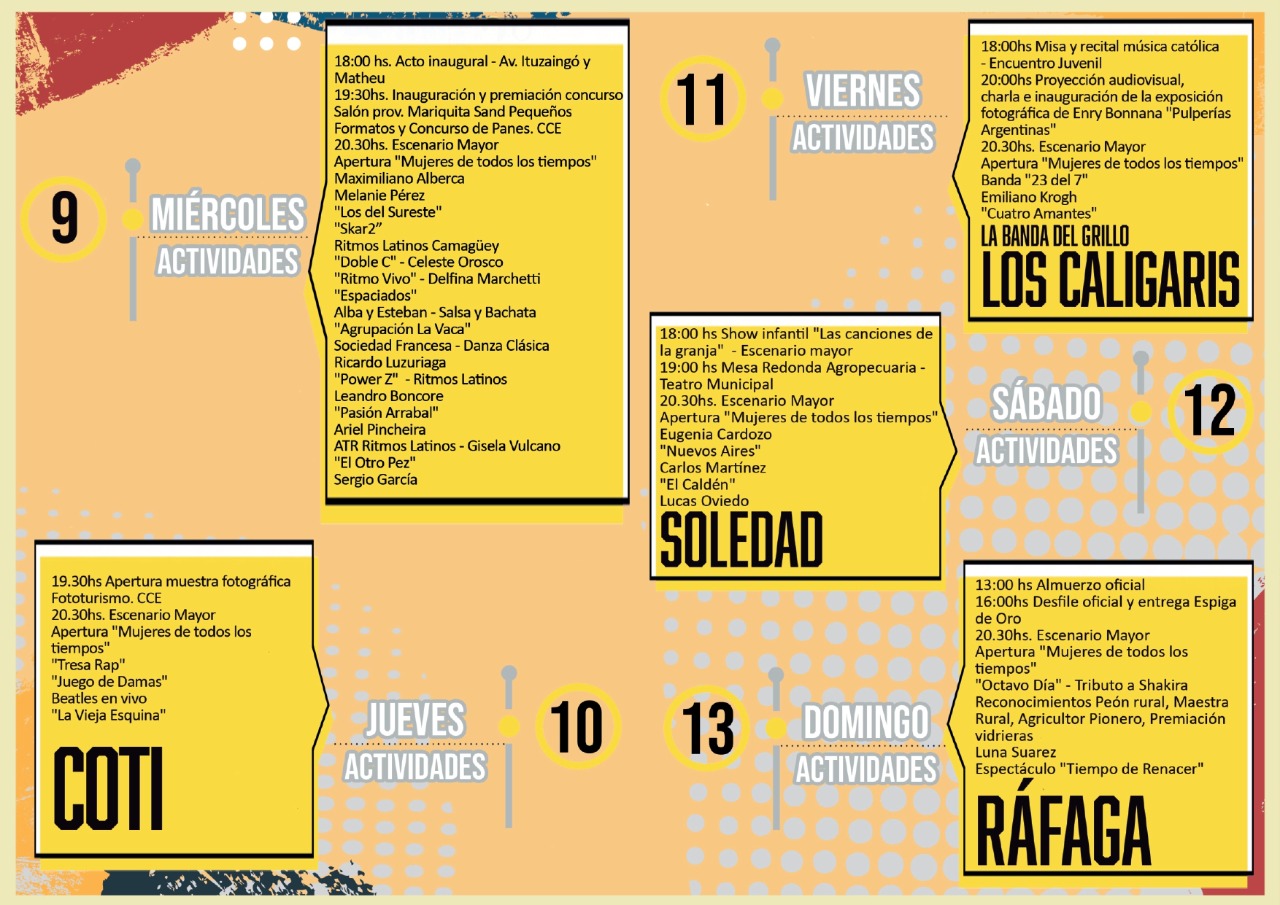 Tanto las actuaciones de los números locales del miércoles, como la de Coti el jueves, Los Caligaris y La Banda de Grillo del viernes y la presentación del espectáculo La Granja del Sábado a las 18 horas, serán con entrada libre y gratuita de acuerdo al orden de llegada.