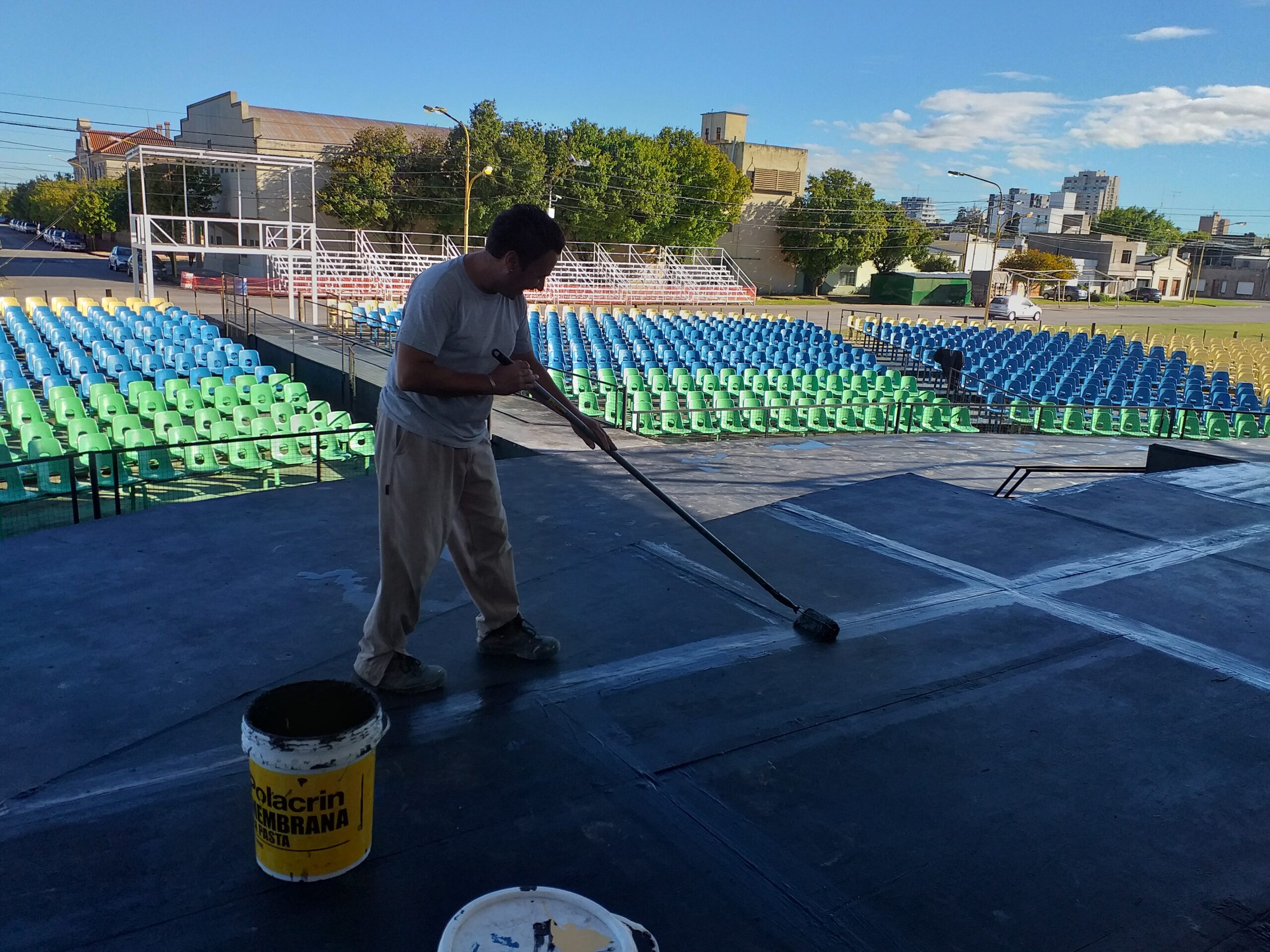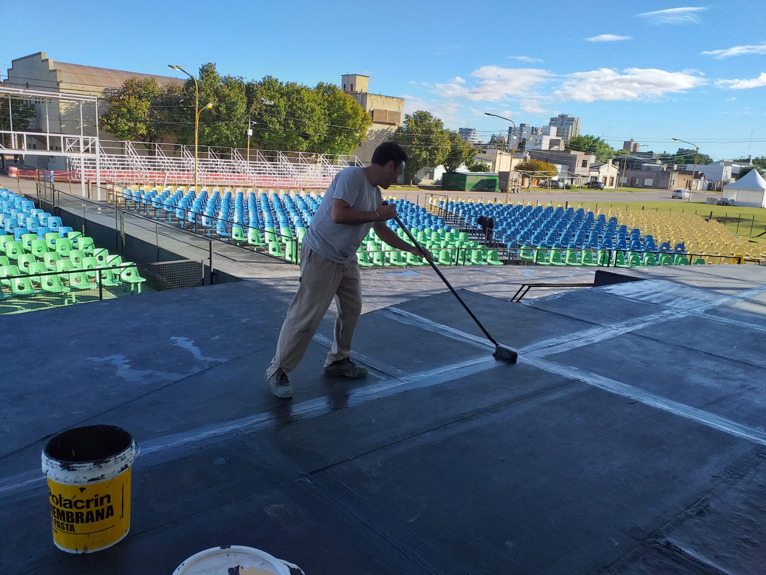 Cuadrillas de las áreas de Paseos Públicos y Electrotecnia prosiguen con el cronograma de tareas sobre el Escenario Mayor Juan Pesalaccia mediante el pintado del mismo.