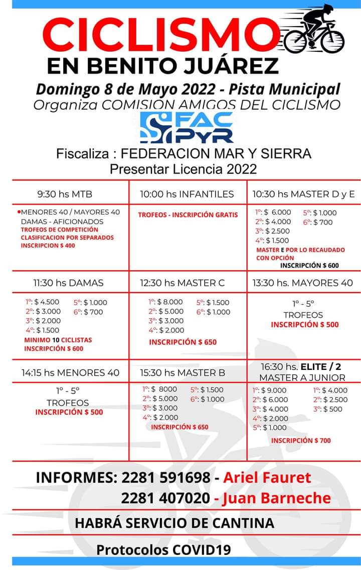 El ciclismo local también tuvo acción en Juárez, con una prueba de pista en la cuál participaron Juan Centeno, Damián Yáñez y José María Ferrari en aficionados. En infantiles se presentaron Delia y Marianella Ferrari.