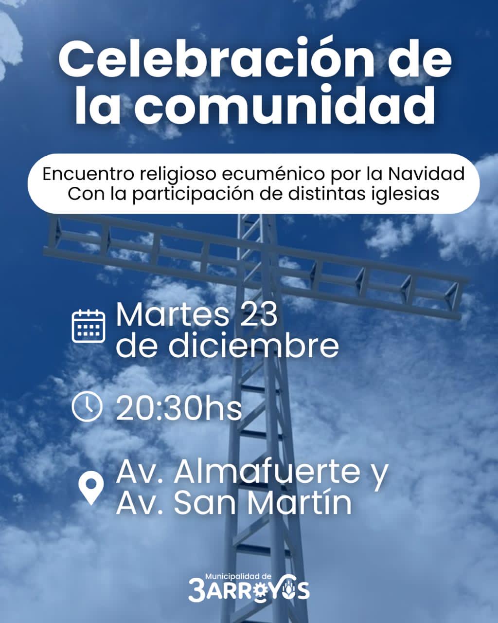 La Municipalidad de Tres Arroyos invita a toda la comunidad a participar del Encuentro Religioso Ecuménico por la Navidad, que se llevará a cabo el próximo martes 23 de diciembre a las 20:30 horas. La ceremonia tendrá lugar en la Cruz del Centenario, ubicada en la intersección de Avenida San Martín y Avenida Almafuerte.