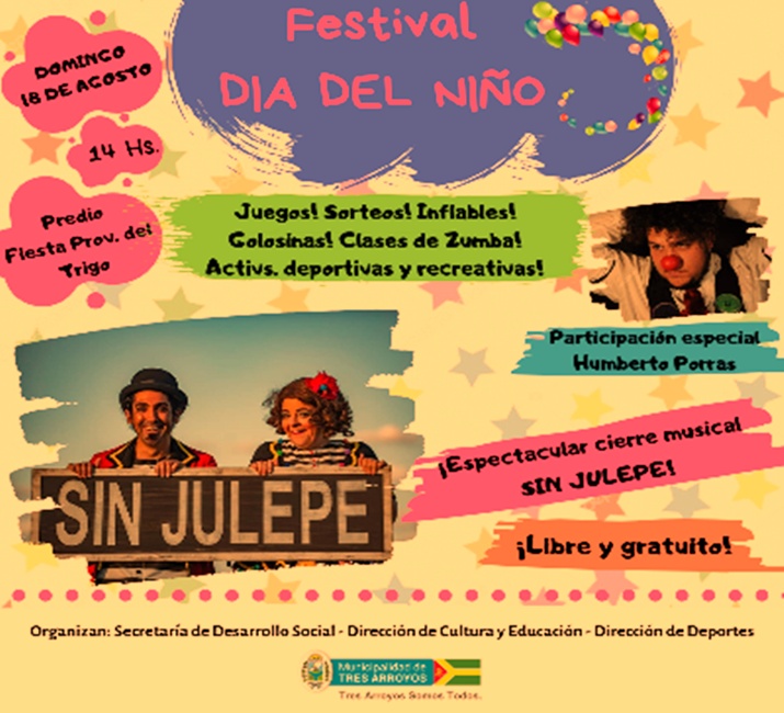 La Municipalidad de Tres Arroyos a través de la Secretaría de Desarrollo Social, Dirección de Cultura y Educación y Dirección de Deportes, realizará un Festival por el Día del Niño este domingo 18 a partir de las 14 horas en el predio de la Fiesta provincial del Trigo y en el marco de la 20° Feria Nacional de Artesanos.