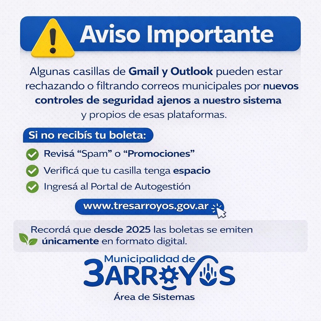 La Municipalidad de Tres Arroyos advierte sobre inconvenientes en la entrega de correos electrónicos y refuerza el uso del Portal de Autogestión