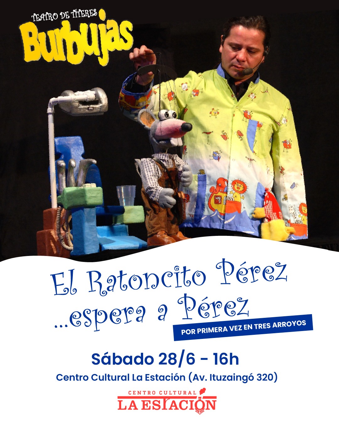 El próximo sábado 28 de junio a las 16 h, e​n la sala de teatro «Ricardo Listorti» del Centro Cultural La Estación (Av. Ituzaingó 320) se llenará de magia, risas y fantasía con la presentación de la obra de títeres «El Ratoncito Pérez… espera a Pérez», del grupo Burbujas.