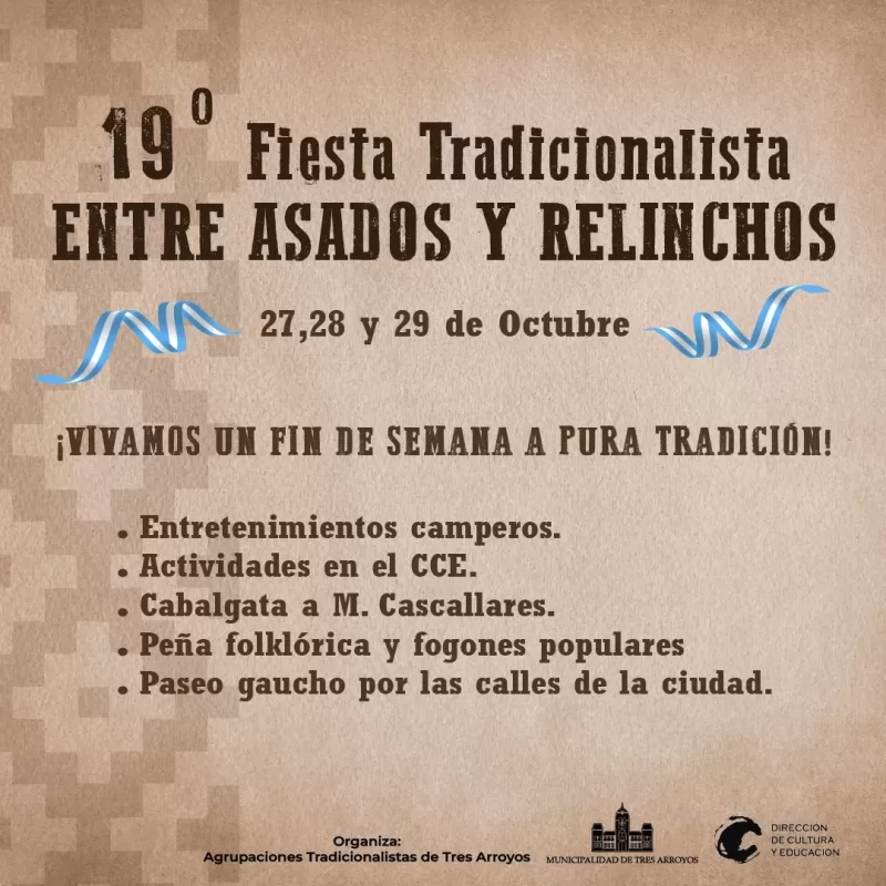 La Dirección de Cultura y Educación de la Municipalidad de Tres Arroyos y la Comisión de Agrupaciones Tradicionalistas de Tres Arroyos, invitan a la comunidad, a participar de las actividades que se llevarán a cabo en el marco de la 19º fiesta tradicionalistas «Entre Asados y Relinchos».