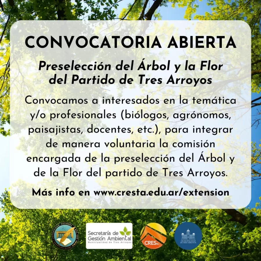 Desde CRESTA, en conjunto con la Secretaría de Gestión Ambiental, la Municipalidad de Tres Arroyos y la Universidad Nacional del Sur, convocamos a interesados en la temática y/o profesionales (biólogos, agrónomos, paisajistas, docentes, etc.), para integrar de manera voluntaria la comisión encargada de la preselección del Árbol y de la Flor del partido de Tres Arroyos.