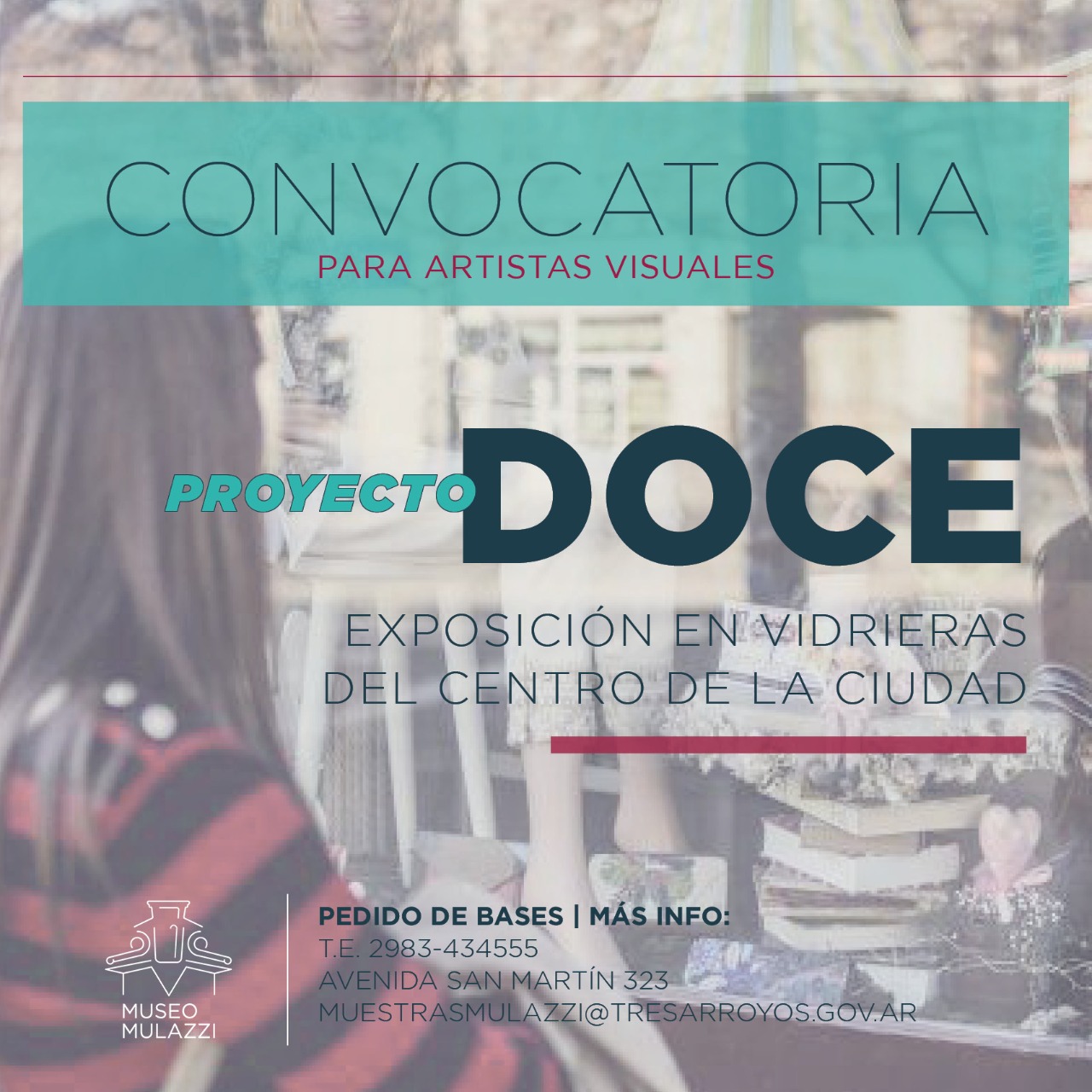 El Museo Mulazzi abre la convocatoria para Proyecto DOCE, la exposición en vidrieras de la ciudad para artistas visuales. El llamado se encuentra abierto hasta el 31 de diciembre de 2021 y los interesados en formar parte deberán comunicarse por correo electrónico a muestrasmulazzi@tresarroyos.gov.ar
