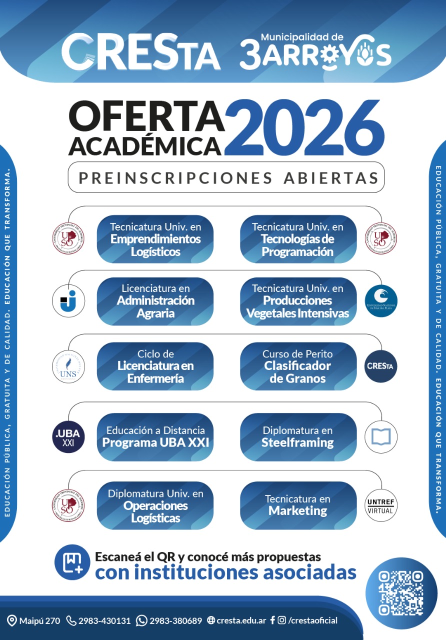 El Centro Regional de Estudios Superiores de Tres Arroyos (CRESTA) anunció su oferta académica para el ciclo 2026, con una amplia variedad de propuestas formativas que amplían las oportunidades de estudio y desarrollo en Tres Arroyos y la región.