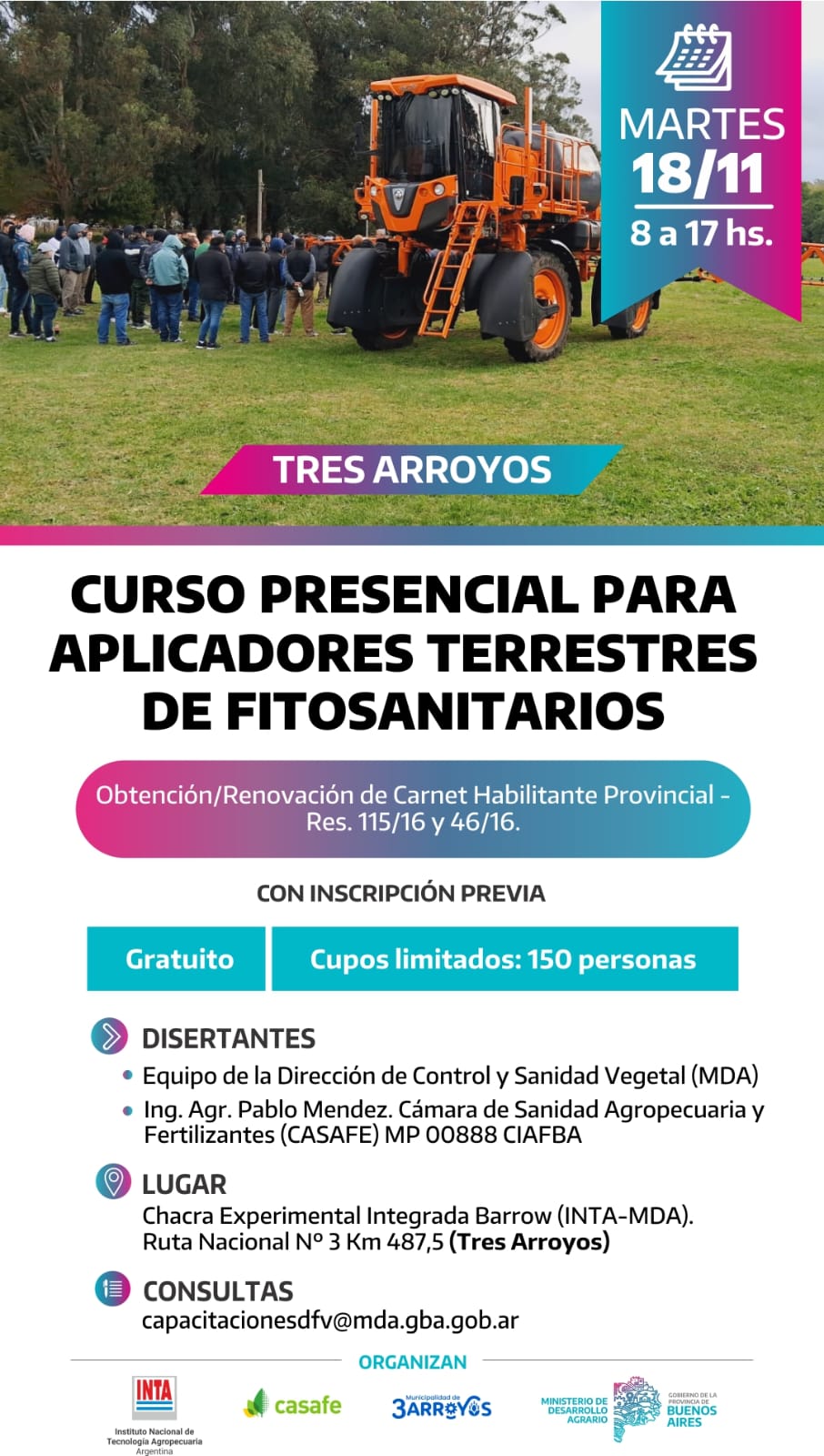 El próximo martes 18 de noviembre, de 8 a 17 horas, se realizará en Tres Arroyos el Curso Presencial para Aplicadores Terrestres de Fitosanitarios, destinado a la obtención o renovación del Carnet Habilitante Provincial (Res. 115/16 y 46/16).