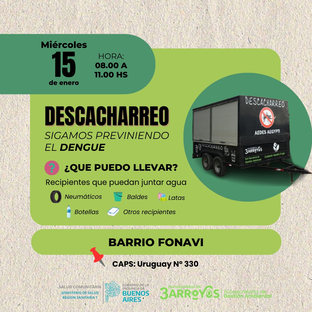 El día miércoles 15/01, la Subsecretaría de Gestión Ambiental en conjunto con los promotores de Salud Comunitaria Provincia, estarán presentes en el barrio Fonavi de 8 a 11 hs con el carro para descacharrear. El carro se ubicará en el CAPS (Uruguay n°330) y se invita a los vecinos/as a que se acerquen.