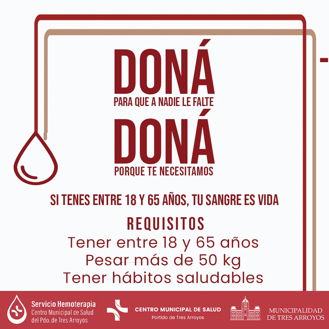 El Servicio de Hemoterapia del Centro Municipal de Salud y Unidos por Vos realizarán una colecta externa de sangre el jueves 18 de 8.30 horas en adelante.