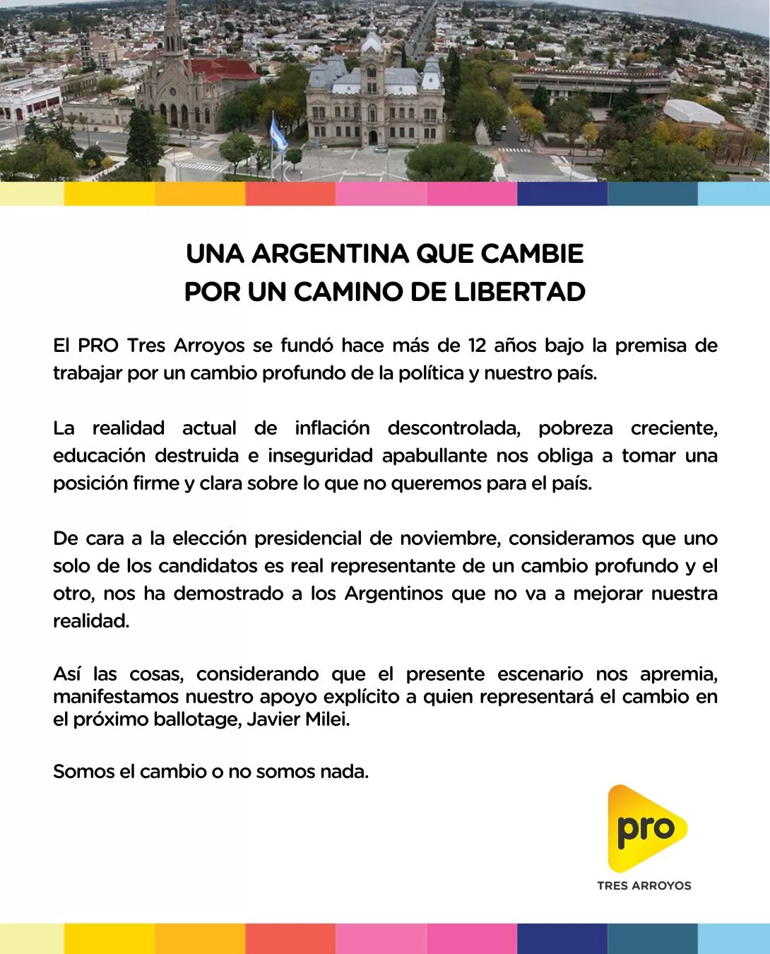 El Pro Tres Arroyos manifestó su «apoyo explícito» a la candidatura presidencial de Javier Milei, quien enfrentará en el ballotage al candidato de Unión por la Patria Sergio Massa, días después del espaldarazo brindado al economista libertario de parte del expresidente Mauricio Macri y la excandidata Patricia Bullrich.