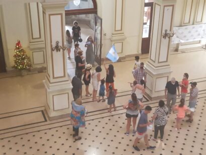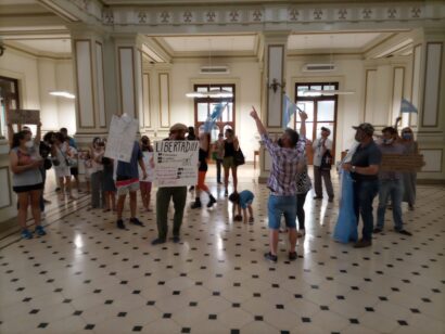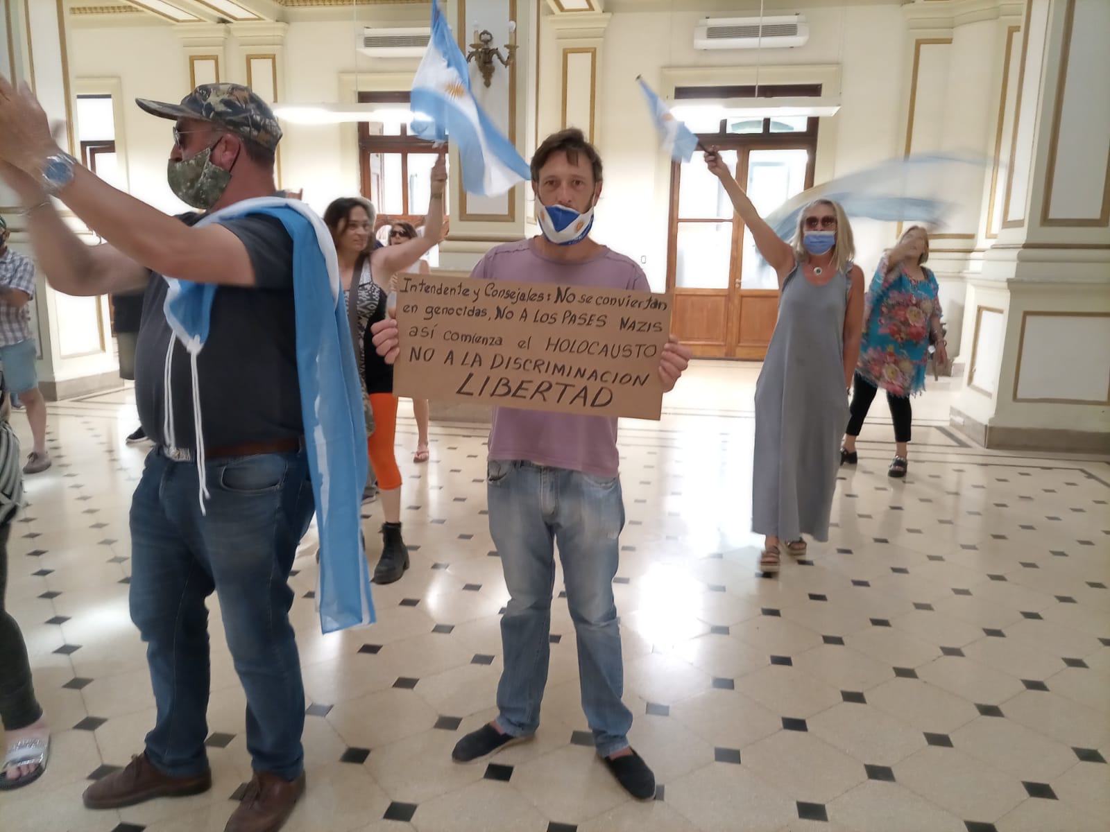 Un grupo de manifestantes antivacunas y antipase sanitario se movilizó al Salón Blanco municipal, en el marco de la sesión extraordinaria por el Presupuesto 2022.