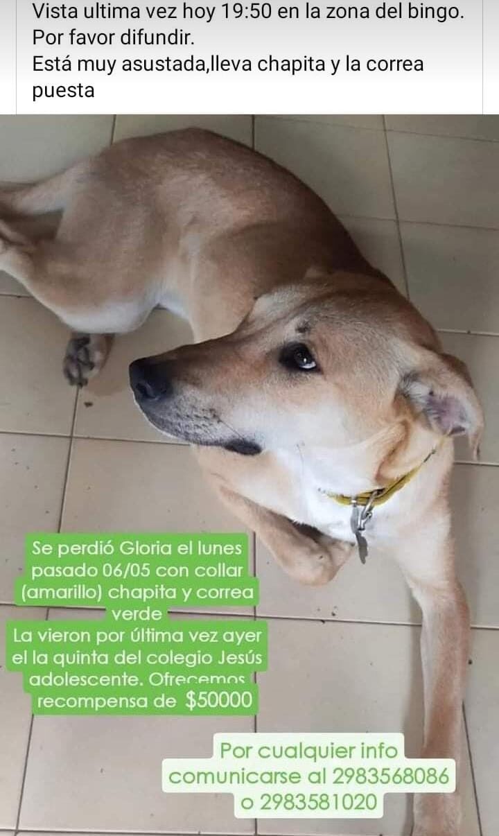 El animal responde al nombre de Gloria, es de contextura mediana y color marrón claro. Porta un collar amarillo, es de carácter afable y fue vista ayer entre el sector del Bingo Tres Arroyos sobre ruta 3 y la zona de la quinta del Colegio Jesús Adolescente en Caseros al 3000.