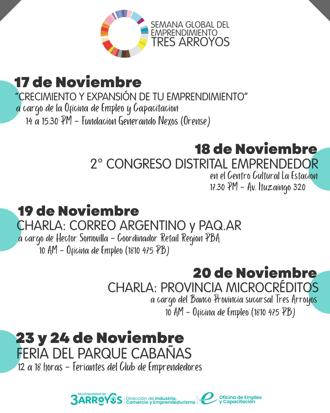 En el marco de la Semana Global del Emprendimiento, la Municipalidad de Tres Arroyos y la Oficina de Empleo y Capacitación desarrollarán una agenda de actividades abiertas a la comunidad emprendedora entre el 17 y el 24 de noviembre, con charlas técnicas, espacios de formación y una feria de emprendedores.