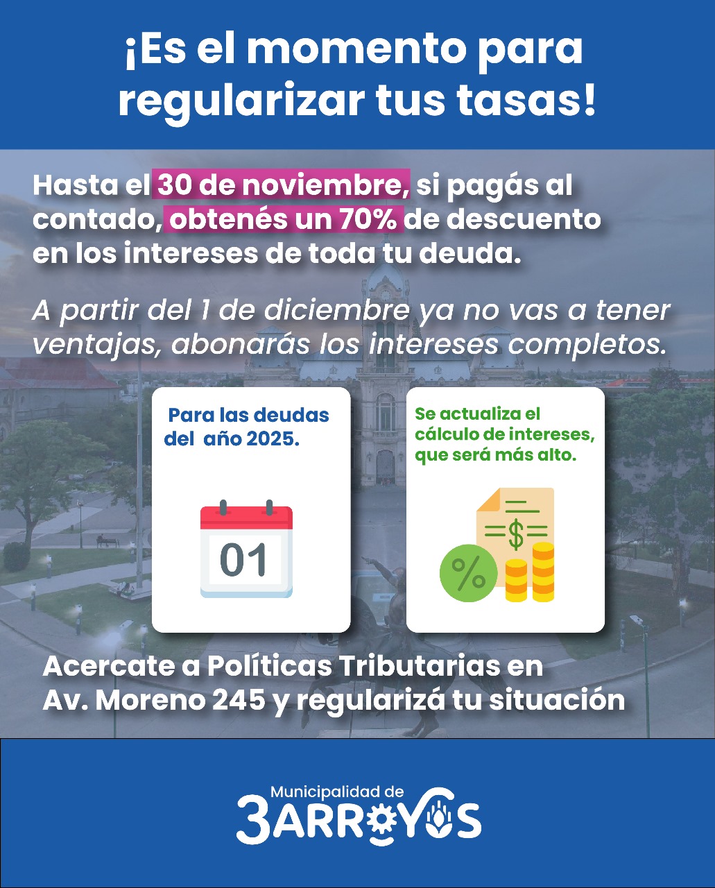 El Municipio de Tres Arroyos informa que, hasta el 30 de noviembre, los contribuyentes podrán regularizar sus deudas con un 70% de descuento en los intereses adeudados.
