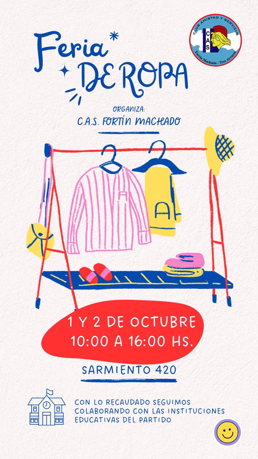 El CAS “Fortín Machado” anuncia la realización de su feria de ropa mensual, que tanto interés despierta por la calidad de las prendas y los bajos precios. Será los días 1 y 2 de octubre, de 10 a 16 horas en Sarmiento 420, con el propósito de seguir colaborando con las necesidades de las escuelas y colegios del partido de Tres Arroyos.