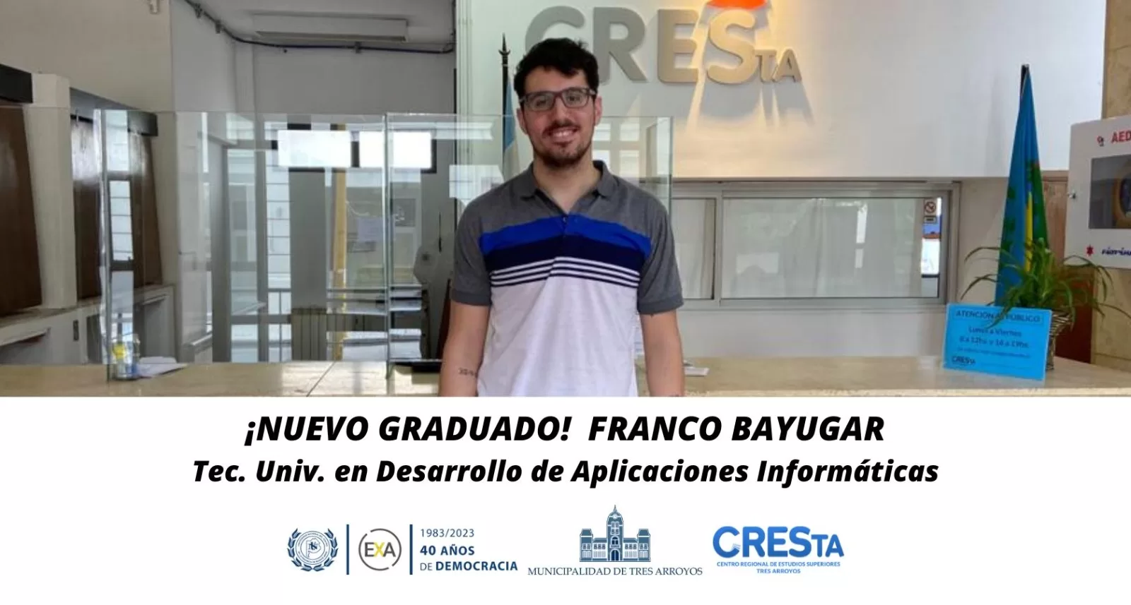 El graduado cursó la carrera en CRESTA, a través del convenio de la Municipalidad con la Facultad de Ciencias Exactas de la Universidad Nacional del Centro de la Provincia de Buenos Aires (UNICEN).