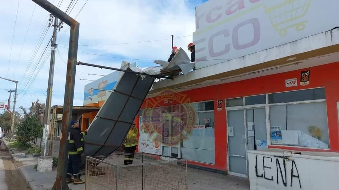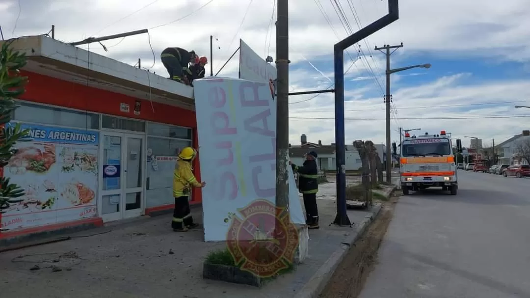 Bomberos Voluntarios de Claromecó debieronn ajar un cartel comercial en avenida 26 entre 9 y 11, que estaba por caerse debido a la acción del viento intenso.