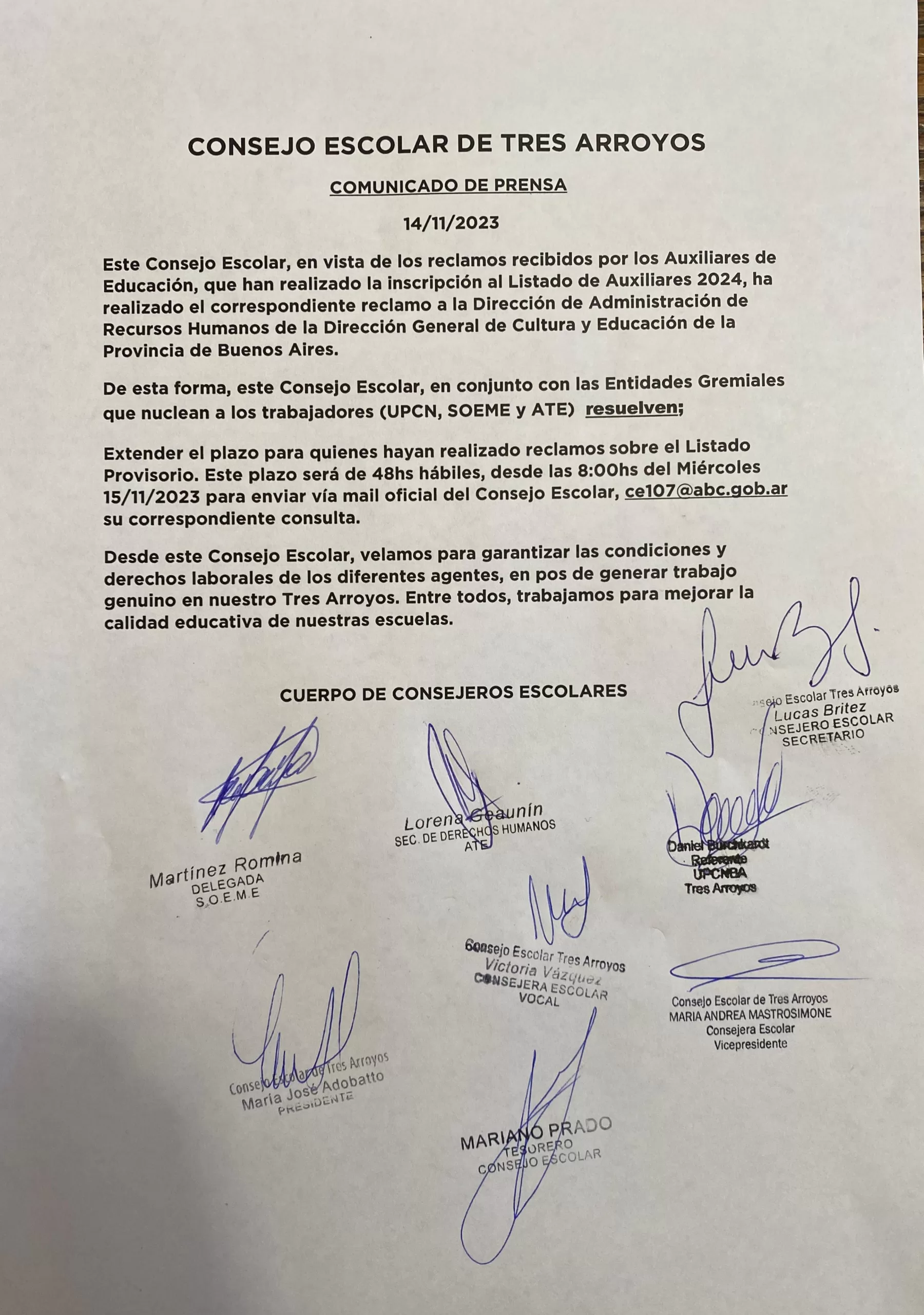 Este plazo será de 48 horas hábiles, desde las 8 del miércoles 15, para enviar vía mail oficial del Consejo Escolar en la casilla ce107@abc.gob.ar.