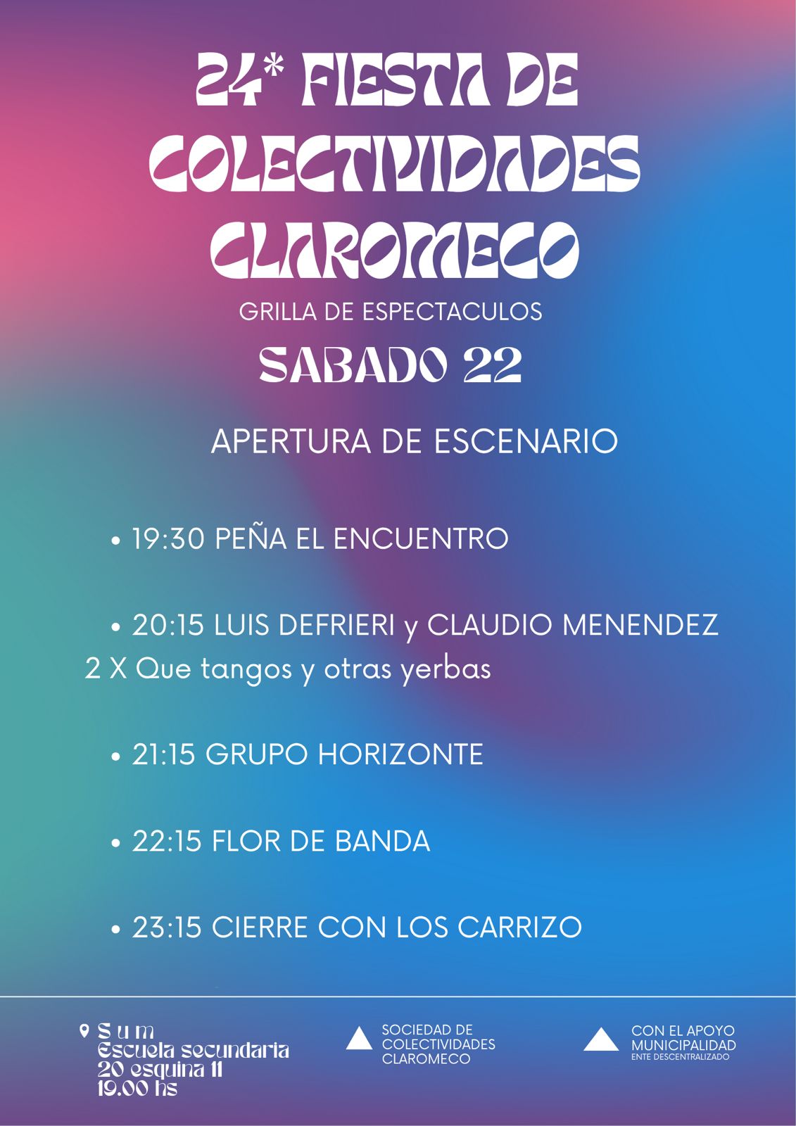 La celebración tendrá lugar en el SUM de la Escuela Secundaria de Claromecó, ubicado en calle 20 y 11, frente a la Plaza San Martín. Desde las 19 horas, tanto sábado como domingo, se habilitará el patio gastronómico y el escenario, donde se presentarán artistas locales y regionales.