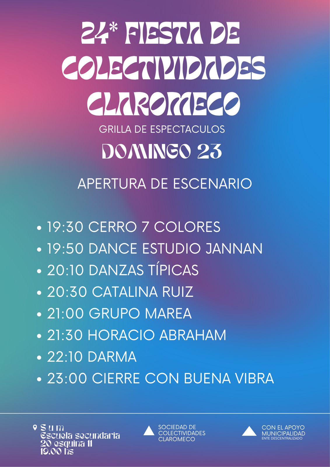 La localidad de Claromecó se prepara para vivir este fin de semana extra largo una nueva edición de la Fiesta de Colectividades, un evento tradicional que este año cumple 24 ediciones y que se desarrollará entre el sábado 22 y el domingo 23 de noviembre, con entrada libre y gratuita. La organización está a cargo de la Sociedad de Colectividades, integrada por representantes de distintos países, bajo la coordinación de Lucas Brites.