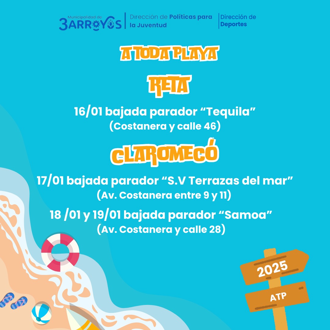 Desde las Direcciones de Políticas para la Juventud y Deportes se informa que habrá un cambio en el cronograma del programa ATP (A Toda Playa): el día Jueves 16 estaremos en Reta, mientras que los días Viernes 17, Sábado 18 y Domingo 19, nos encontraremos en Claromecó. En el horario de 16hs a 19hs con música, juegos y un espacio para divertirse. Los esperamos.