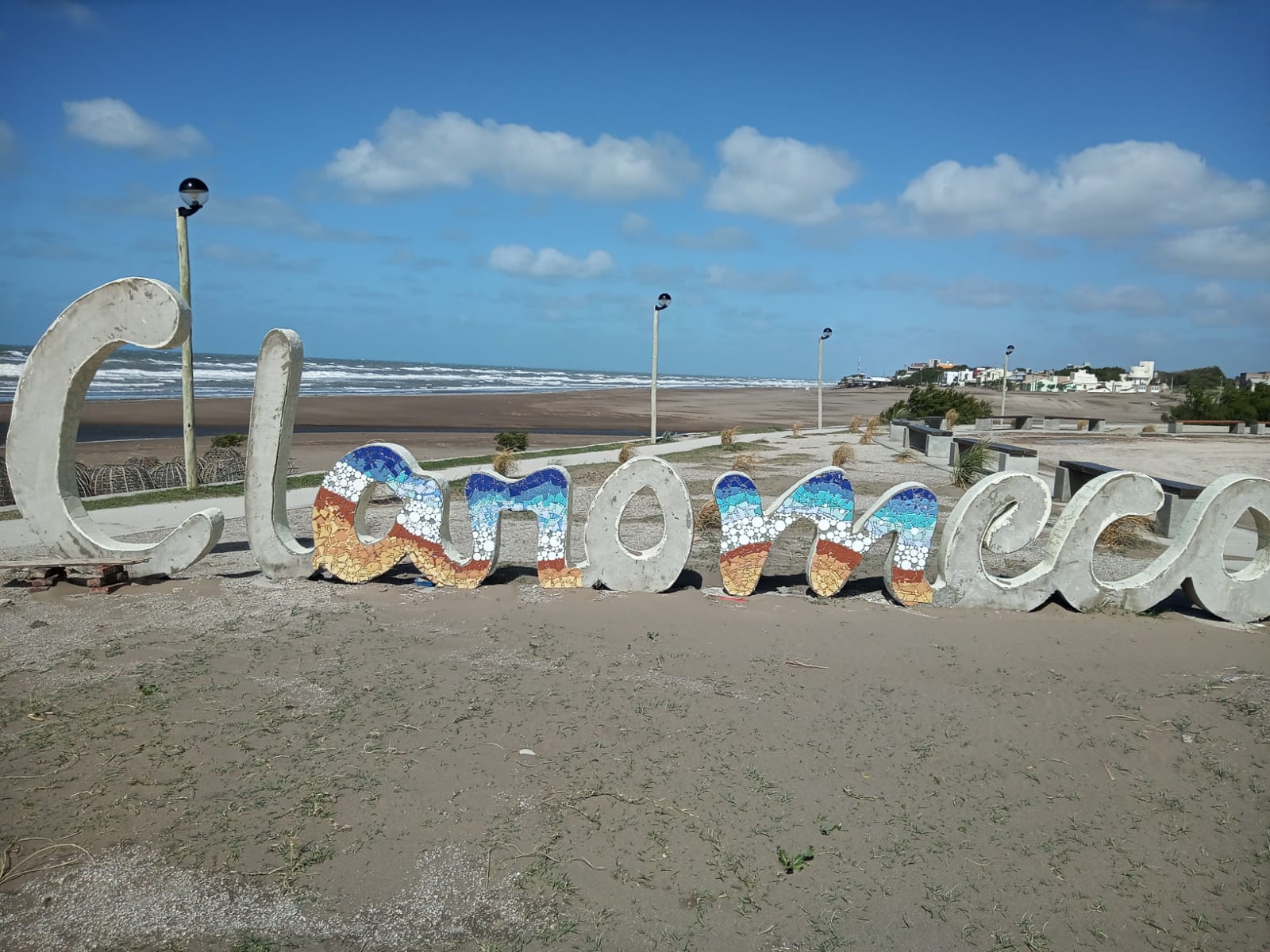 Artistas y voluntarias intervienen un cartel identificatorio en la Costanera claromequense y prevén culminarlo hacia el jueves.